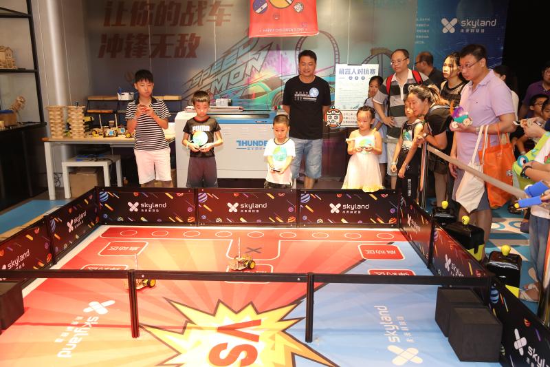 “我跟你說噢,那邊吹出來的泡泡能把我們倆都包進(jìn)去!”“老媽,原來空氣的形狀是圓環(huán)形的呀……”歡聲笑語中,十幾項(xiàng)科技趣味項(xiàng)目讓小朋友們眼花繚亂、目不暇接,這其中,機(jī)器人對抗賽無疑是人氣最高的。賽場上,小朋友們分為紅藍(lán)兩隊(duì),手持遙控器在兩側(cè)站好?!靶∨笥褌冏⒁饫?,每一位機(jī)器人身上有一個(gè)藍(lán)色燈柱,碰撞擋板被撞到后,燈柱長度會(huì)縮短……”老師一邊在“戰(zhàn)場”中擺放機(jī)器人,一邊為孩子們詳細(xì)講解規(guī)則。一聲哨響,紅藍(lán)兩隊(duì)的“機(jī)器人大戰(zhàn)”拉開了帷幕,孩子們操控著自己的戰(zhàn)車,左右閃躲,時(shí)而用一個(gè)漂亮的側(cè)移甩掉追擊者,時(shí)而全力沖擊消耗對方的“藍(lán)條”。賽場邊的家長們似乎比小選手更為緊張,他們時(shí)不時(shí)俯下身子,為孩子們出謀劃策:“小超你看,邊上那個(gè)三號(hào)車藍(lán)條快沒了,快趕過去補(bǔ)一下!”一位父親看到了打破僵局的好機(jī)會(huì),急忙提醒道,小朋友則心領(lǐng)神會(huì),熟練的操縱著機(jī)器人貼了上去……經(jīng)過一番努力,在成功拿下這寶貴的一分后,小朋友回頭與自己的老爸相視一笑,父子二人之間的默契,在這一刻體現(xiàn)的淋漓盡致。