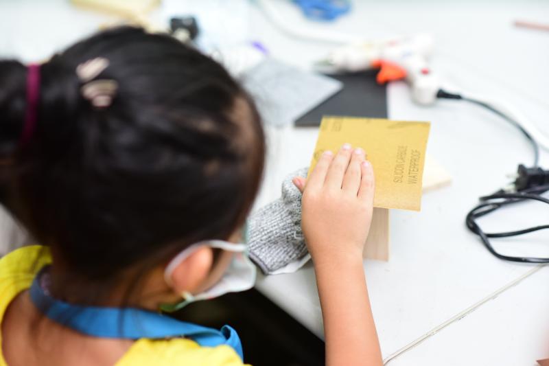 對于“小小木匠”來說,安安靜靜的坐下來,發(fā)揮想象力,傾心打造屬于自己的木質(zhì)音樂盒,無疑是最開心的時刻。聽完老師的講解后,小朋友們迅速進(jìn)入角色,他們拿著原料木材,一個個化身“小魯班”,用尺子“計較長短”,為它們“改頭換面”起來?;顒蝇F(xiàn)場,一位小朋友正拿著砂紙,小心翼翼的打磨木料,再問及他打磨的工序時,小朋友頗具匠心的告誡記者:“先要用這種粗一點的砂紙打磨,再用這個細(xì)的,這樣打磨出來的音樂盒表面就特別光滑啦……”