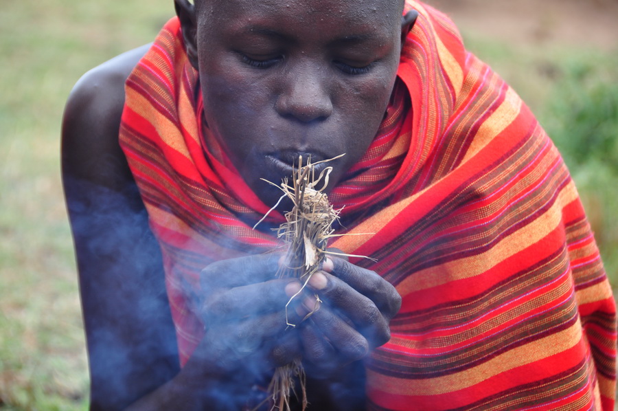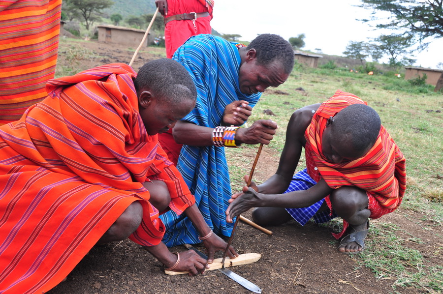 馬賽人盛行一夫多妻制。成年男子蓄發(fā)編成小辮,年輕婦女剃光頭。近年來,定居的馬賽兒童開始上學(xué),已出現(xiàn)少數(shù)馬賽人知識分子。圖為為游客表演鉆木取火等節(jié)目的馬賽人。李仁奇 攝