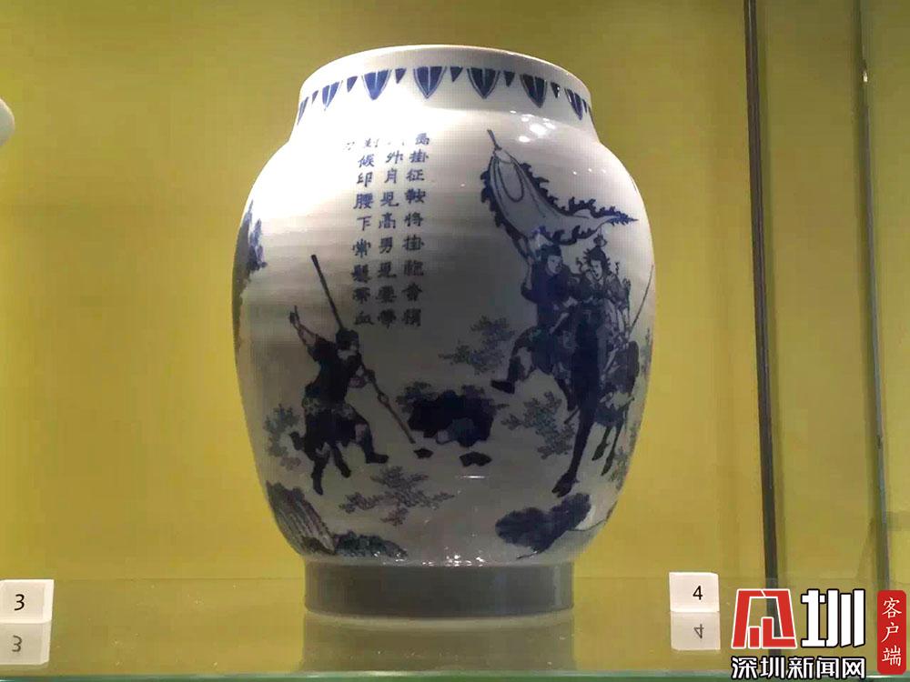 一件青花瓷瓶上有如下配圖詩文:“馬褂征鞍將褂袍,柳梢門外月兒高;男兒要帶封侯印,腰下常懸?guī)а??!?/p>