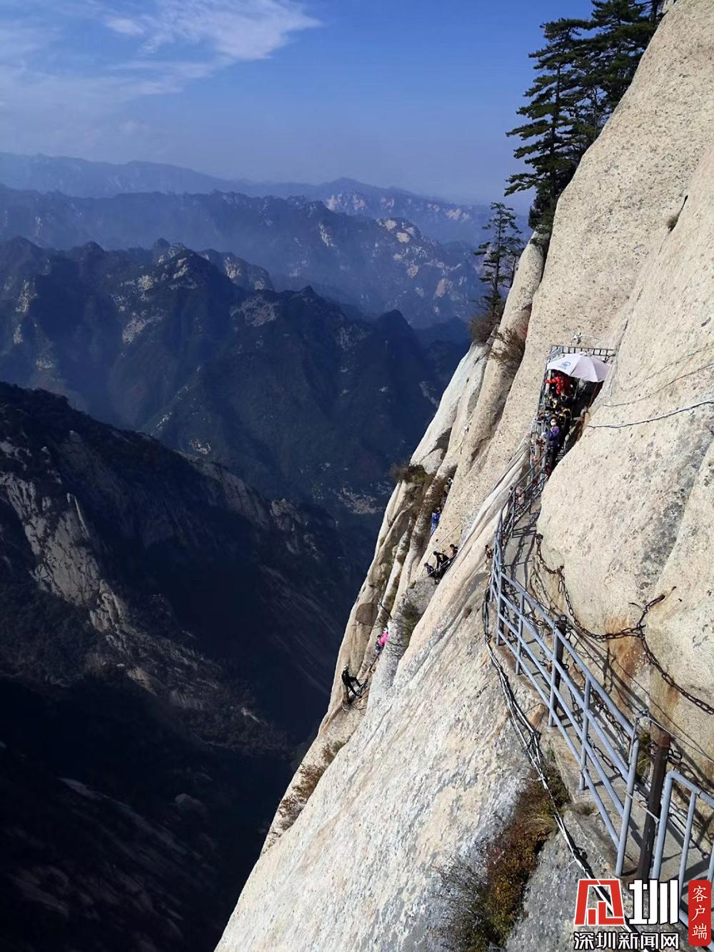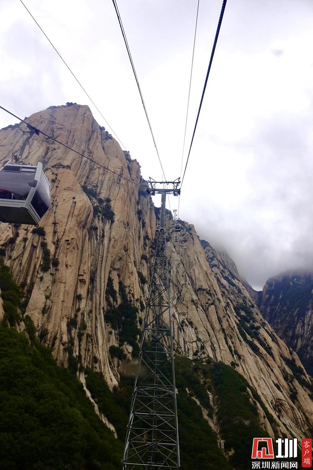 華山西峰的太華索道是迄今為止世界上第一條采取崖壁開鑿硐室站房、兩上兩下的起伏式走向、設(shè)中間站的單線循環(huán)脫掛式索道,總計投資5億余元建設(shè)。李酮攝。