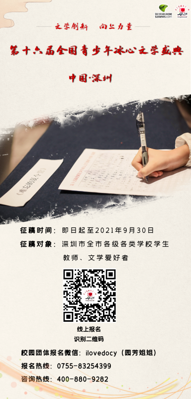 讀特客戶端·深圳新聞網(wǎng)2021年7月19日訊 為繼承和發(fā)揚(yáng)中華文化及冰心文學(xué)精神,促進(jìn)中華文化、中國(guó)現(xiàn)代化文學(xué)史更深入地植入深圳下一代青少年心中,2021年“第十六屆全國(guó)青少年冰心文學(xué)盛典中國(guó)·深圳”正在愛好文學(xué)的師生學(xué)友們之間熱烈展開。