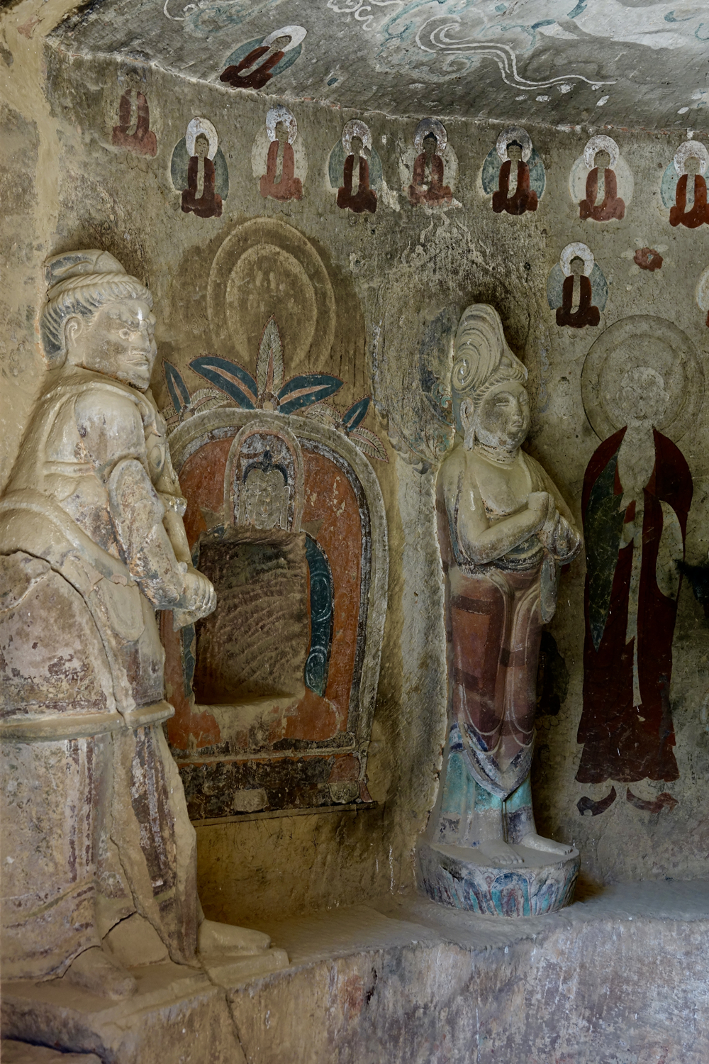 82窟,一結跏趺坐佛二脅侍菩薩,佛左右壁畫二弟子??唔敽烷T道露出底層,為北周原作,表層壁畫為明代重繪。李仁奇 攝