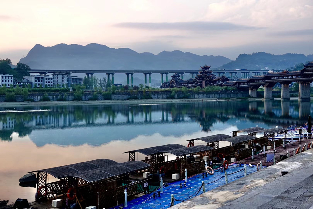 橫跨于濯水古鎮(zhèn)阿蓬江上的超長(zhǎng)廊橋有“世界第一風(fēng)雨廊橋”之稱(chēng)。李仁奇 攝