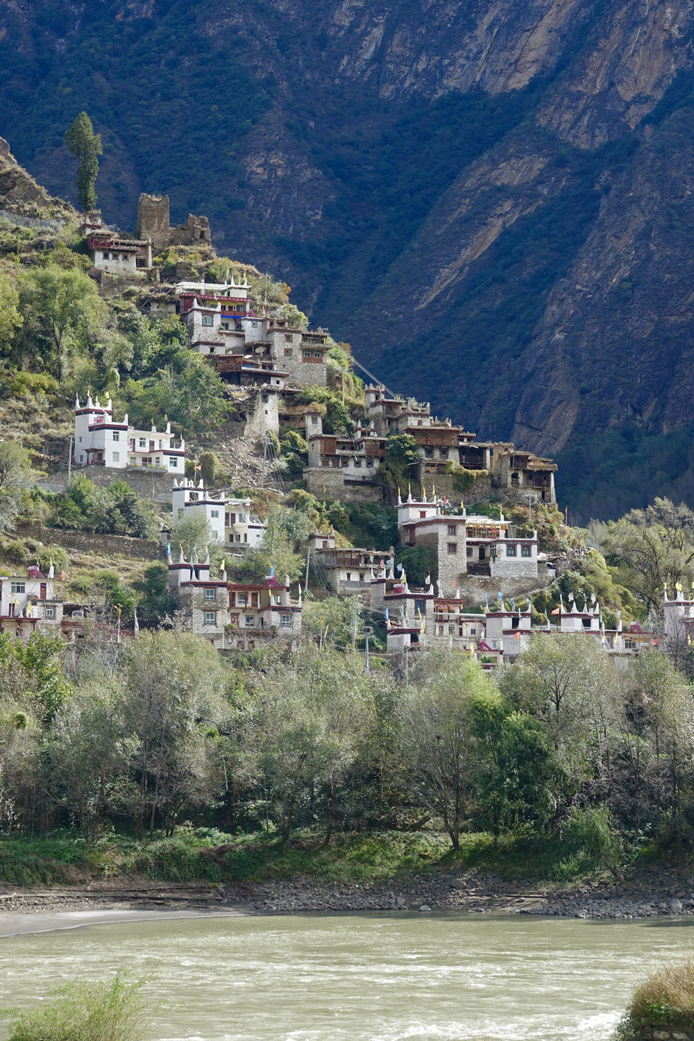 屋頂四個(gè)角落有白色的小佛塔,代表著山、樹、水、地四方神的四角,上面還插著經(jīng)幡,每逢節(jié)日會(huì)進(jìn)行祭祀,代表著嘉絨藏族的民俗風(fēng)情。李仁奇 攝