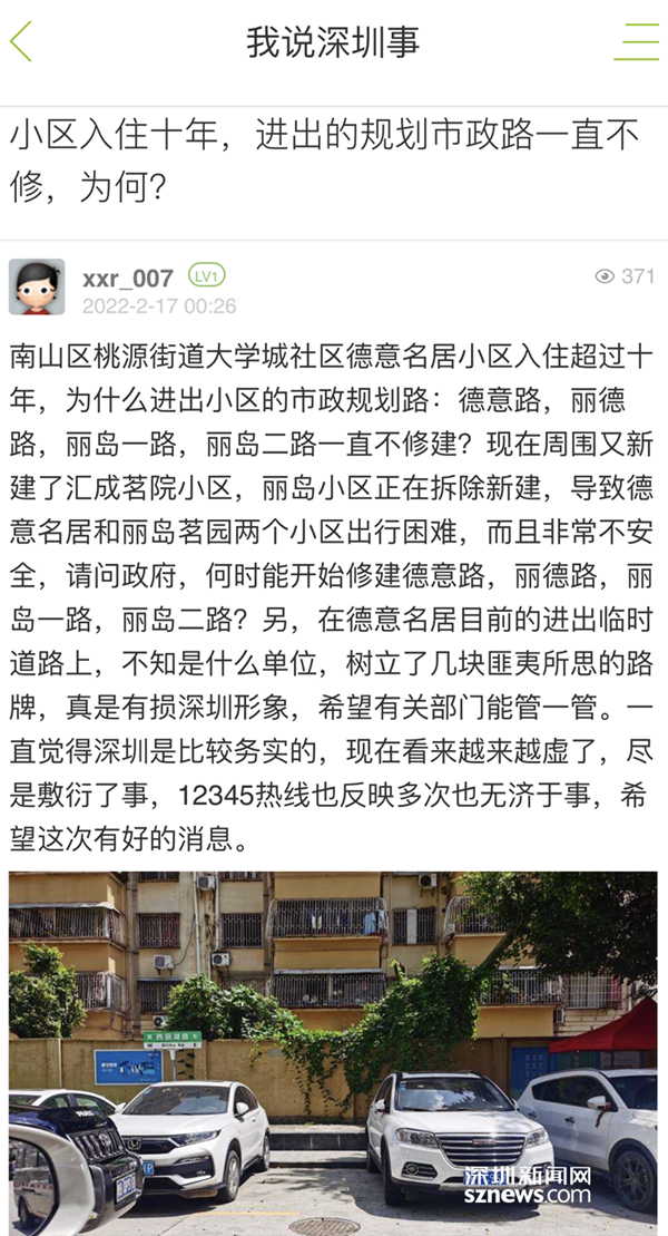 讀特客戶端·深圳新聞網(wǎng)2022年2月18日訊(記者 馮牧原 實習(xí)生 彭軼群)近日,有網(wǎng)友在深圳新聞網(wǎng)深圳論壇上報料稱,南山區(qū)桃源街道德意名居小區(qū)入住已超過10年,但進出小區(qū)的市政規(guī)劃路長期未修建,導(dǎo)致居住在附近小區(qū)的居民出行困難,車輛違停占用消防通道也存在安全隱患。