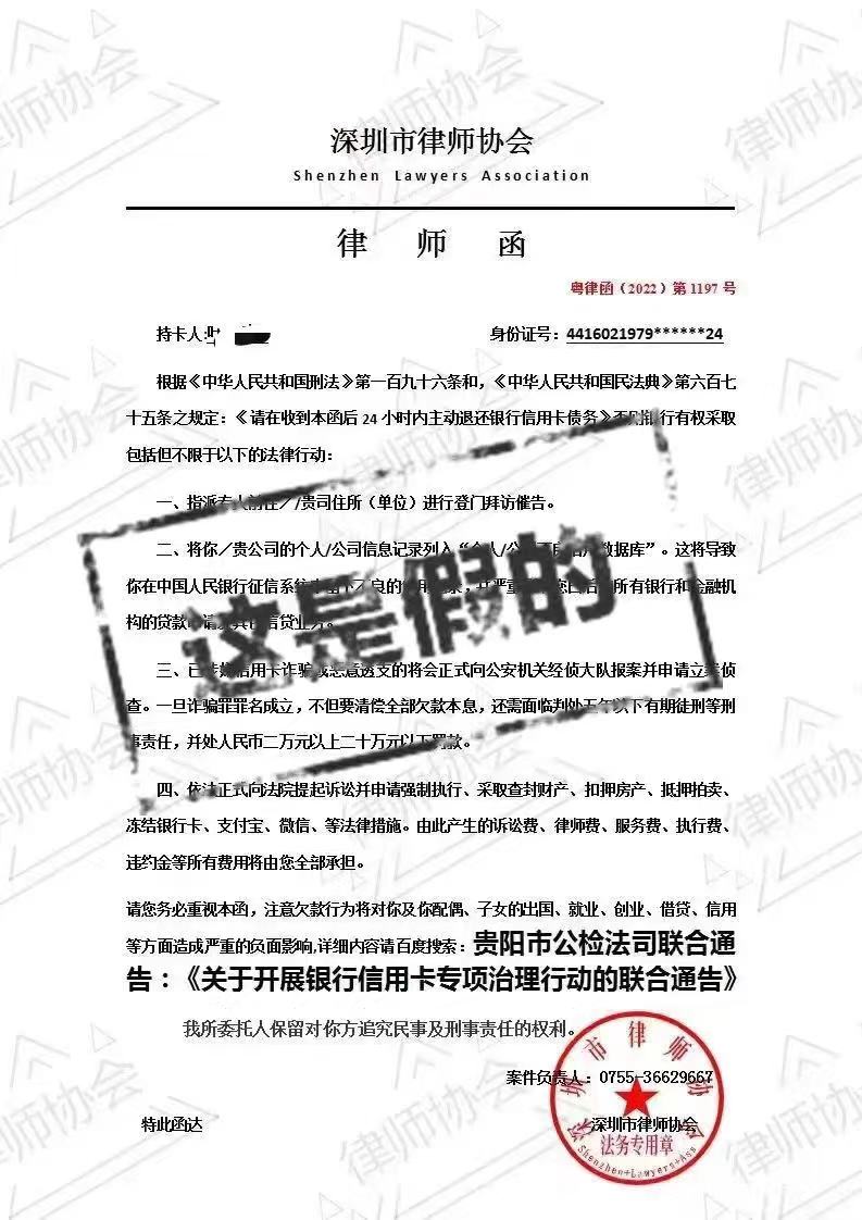 讀特客戶端·深圳新聞網(wǎng)2022年10月10日訊(記者 翁任瑩 張玲)近日,有人假冒“深圳市律師協(xié)會(huì)”名義發(fā)出催收信用卡債務(wù)的所謂“律師函”,并蓋上“深圳市律師協(xié)會(huì)”法務(wù)專用章。