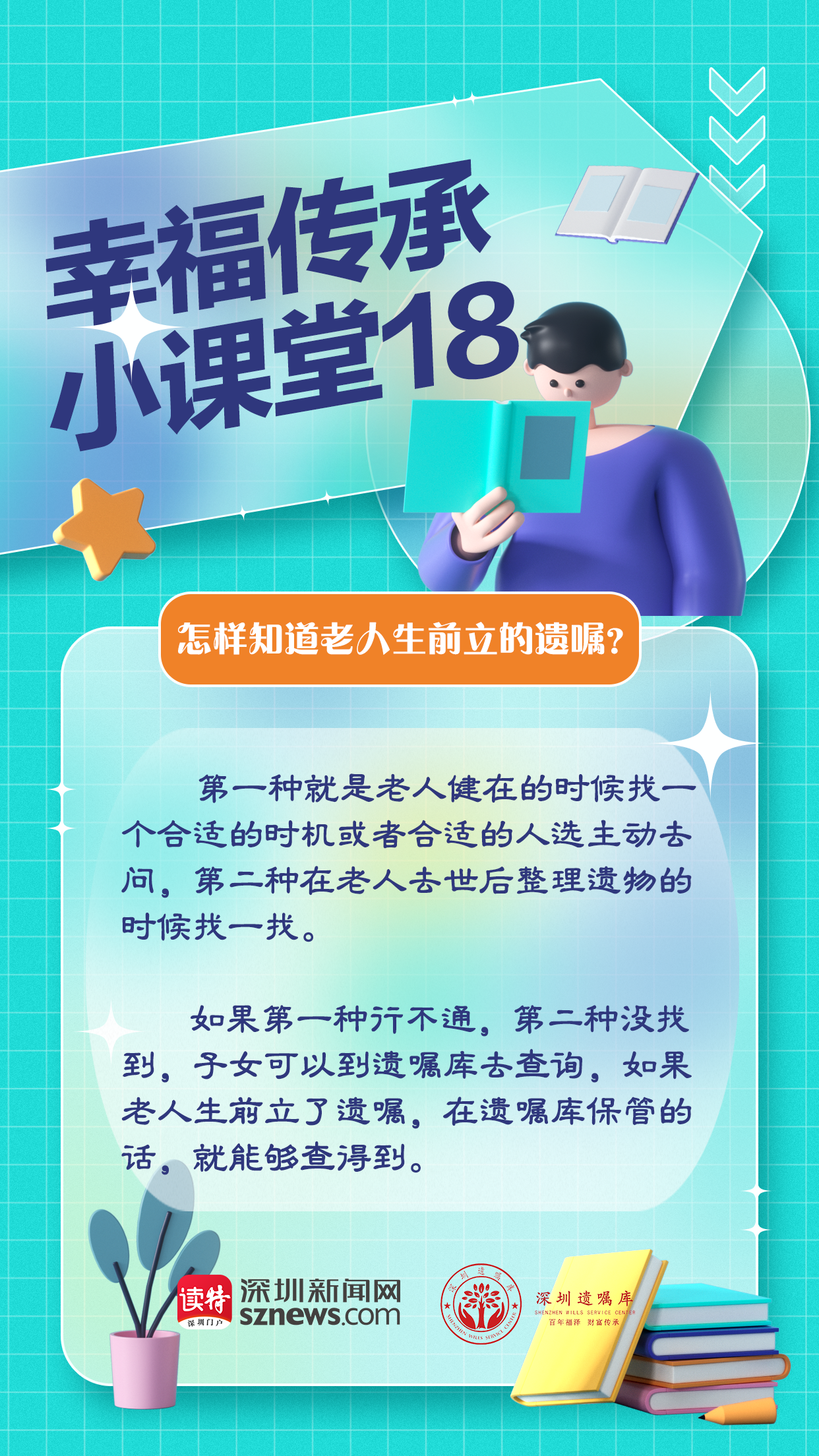 還有一種方法是在老人去世后整理遺物的時(shí)候可能發(fā)現(xiàn)書面遺囑。當(dāng)然還有第三種辦法。由深圳新聞網(wǎng)聯(lián)合廣東嘉得信律師事務(wù)所、深圳遺囑庫特別策劃的“幸福傳承小課堂”第18期,我們來聊聊第三種辦法查詢老人生前立的遺囑。如果第一種辦法行不通,第二種辦法又找不到的話,我們的建議是,可以去遺囑庫查詢。在老人去世后,如果老人生前立了遺囑,在遺囑庫保存的話,就可以找得到。