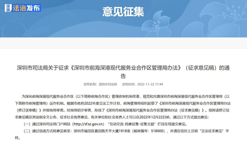 《深圳市前海深港現(xiàn)代服務(wù)業(yè)合作區(qū)管理局辦法》向社會各界征求意見