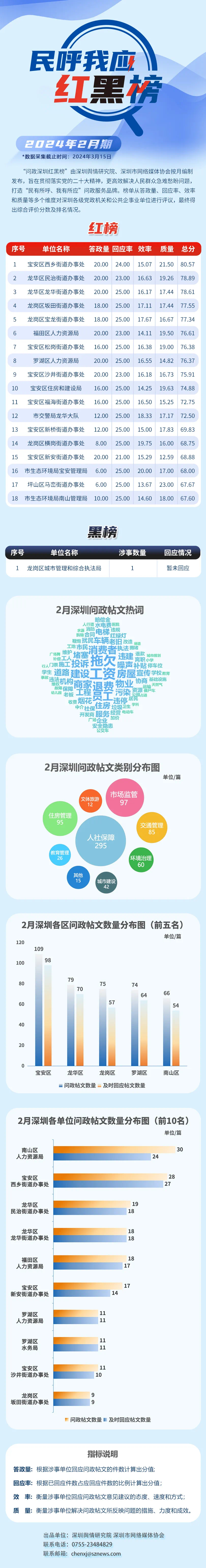 本期榜單采集的帖文主要來自深圳論壇、深圳各區(qū)政府官網(wǎng)、人民網(wǎng)領(lǐng)導(dǎo)留言板及深圳新聞網(wǎng)“民呼我應(yīng)”等平臺(tái),所采集帖文發(fā)布時(shí)間為2024年2月1日至2月29日,采集截止時(shí)間為2024年3月15日。榜單具有科學(xué)、合理、完備的綜合評(píng)價(jià)體系,能夠從答政量、回應(yīng)率、效率和質(zhì)量等多個(gè)維度對(duì)深圳各級(jí)黨政機(jī)關(guān)和公共企事業(yè)單位進(jìn)行評(píng)議。