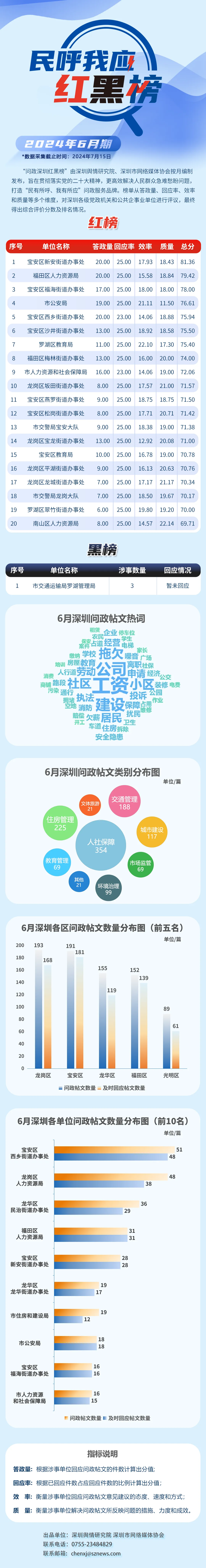 2024年6月,共有20家單位因積極解決民生問題,認(rèn)真細(xì)致答政,登上“紅榜”,它們分別是:寶安區(qū)新安街道辦事處、福田區(qū)人力資源局、寶安區(qū)福海街道辦事處、市公安局、寶安區(qū)西鄉(xiāng)街道辦事處、寶安區(qū)沙井街道辦事處、羅湖區(qū)教育局、福田區(qū)梅林街道辦事處、市人力資源和社會保障局、龍崗區(qū)坂田街道辦事處、寶安區(qū)燕羅街道辦事處、寶安區(qū)松崗街道辦事處、市交警局寶安大隊、龍崗區(qū)寶龍街道辦事處、寶安區(qū)教育局、龍崗區(qū)平湖街道辦事處、龍崗區(qū)龍城街道辦事處、市交警局龍崗大隊、羅湖區(qū)翠竹街道辦事處、南山區(qū)人力資源局。另外,市交通運(yùn)輸局羅湖管理局因相關(guān)帖文回應(yīng)率偏低,整體答政效果不佳,被列入“黑榜”。