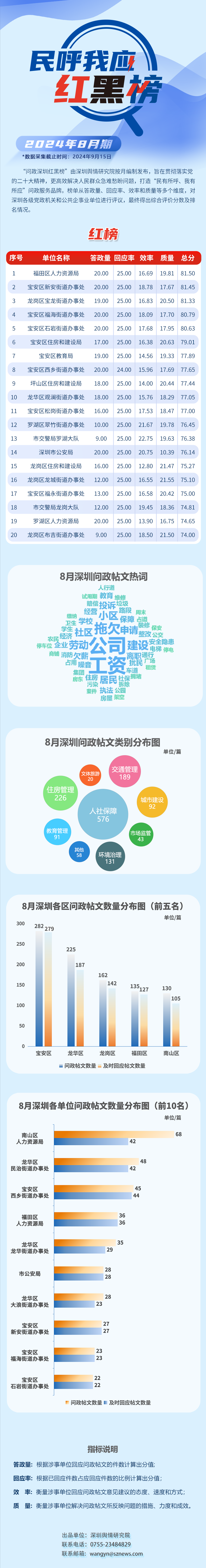 本期榜單采集的帖文主要來自深圳市及各區(qū)政府官網(wǎng)、深圳論壇、人民網(wǎng)領(lǐng)導(dǎo)留言板、深圳新聞網(wǎng)“民呼我應(yīng)”等平臺(tái),所采集帖文發(fā)布時(shí)間為2024年8月1日至8月31日,采集截止時(shí)間為2024年9月15日。