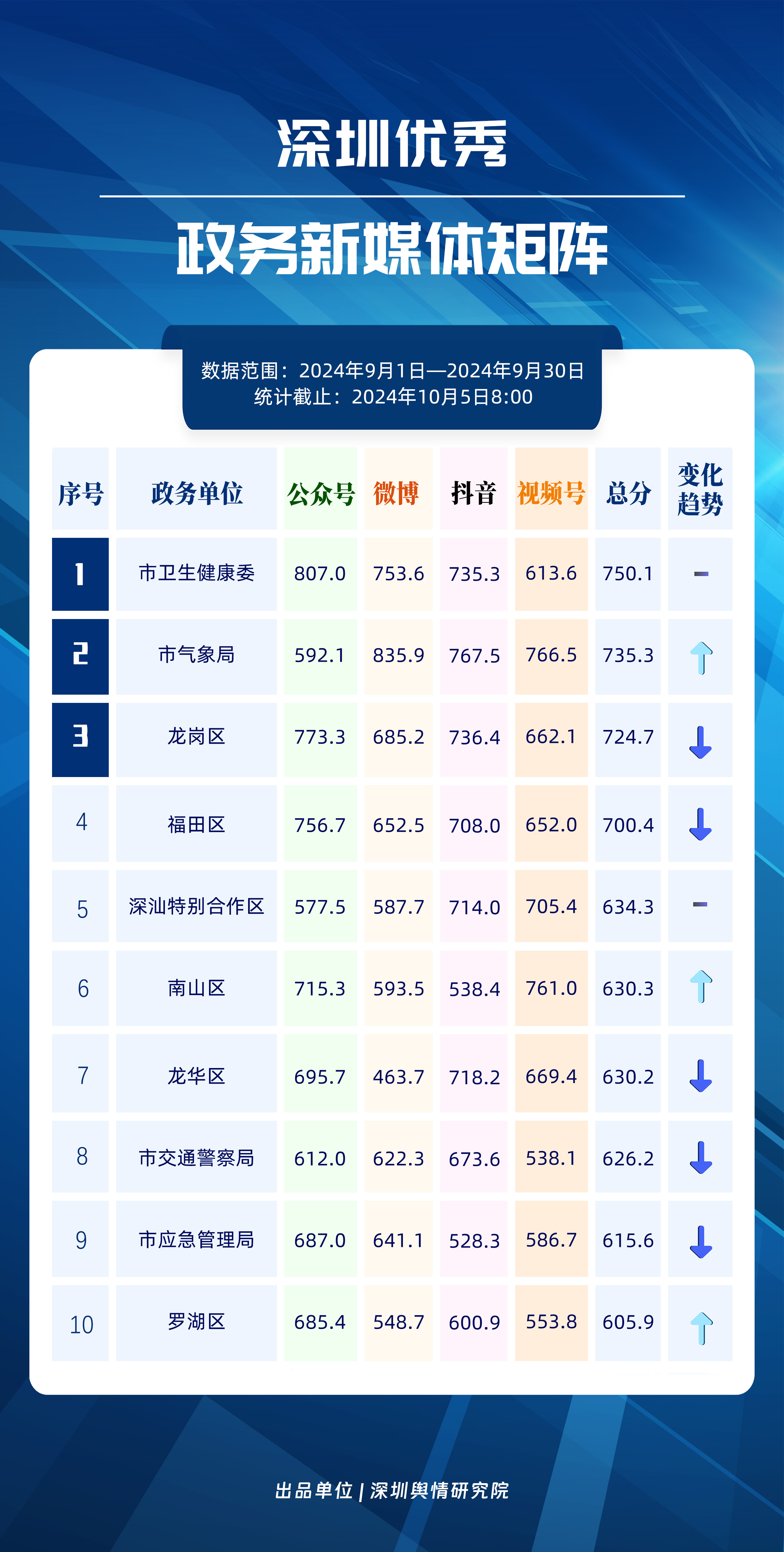 9月,深圳市衛(wèi)生健康委、市氣象局、龍崗區(qū)、福田區(qū)、深汕特別合作區(qū)、南山區(qū)、龍華區(qū)、市交通警察局、市應(yīng)急管理局、羅湖區(qū)榮登“深圳優(yōu)秀政務(wù)新媒體矩陣”榜單。9月,市衛(wèi)生健康委新媒體矩陣穩(wěn)居榜首,市氣象局在抖音、微信視頻號平臺的影響力和傳播力顯著提升,助力其在榜單上位列第二名。位于榜單第三名的是龍崗區(qū)新媒體矩陣,發(fā)布多篇國慶文化活動、音樂會相關(guān)文娛活動宣傳內(nèi)容,獲得較多瀏覽、點贊,吸引市民前往參與。福田區(qū)新媒體矩陣則登上榜單第四名,通過發(fā)布“以舊換新政策”和“暢游福田”等相關(guān)文章,為網(wǎng)民提供實用的信息,提升了新媒體矩陣的傳播力和影響力。此外,9月恰逢2024年全國網(wǎng)絡(luò)安全宣傳周,全市各區(qū)、各單位積極開展網(wǎng)絡(luò)安全宣傳工作,其中市衛(wèi)生健康委與龍華區(qū)合作拍攝網(wǎng)絡(luò)安全主題宣傳短劇,起到幫助市民提高網(wǎng)絡(luò)安全意識的效果,為營造安全的網(wǎng)絡(luò)環(huán)境做出了積極貢獻。