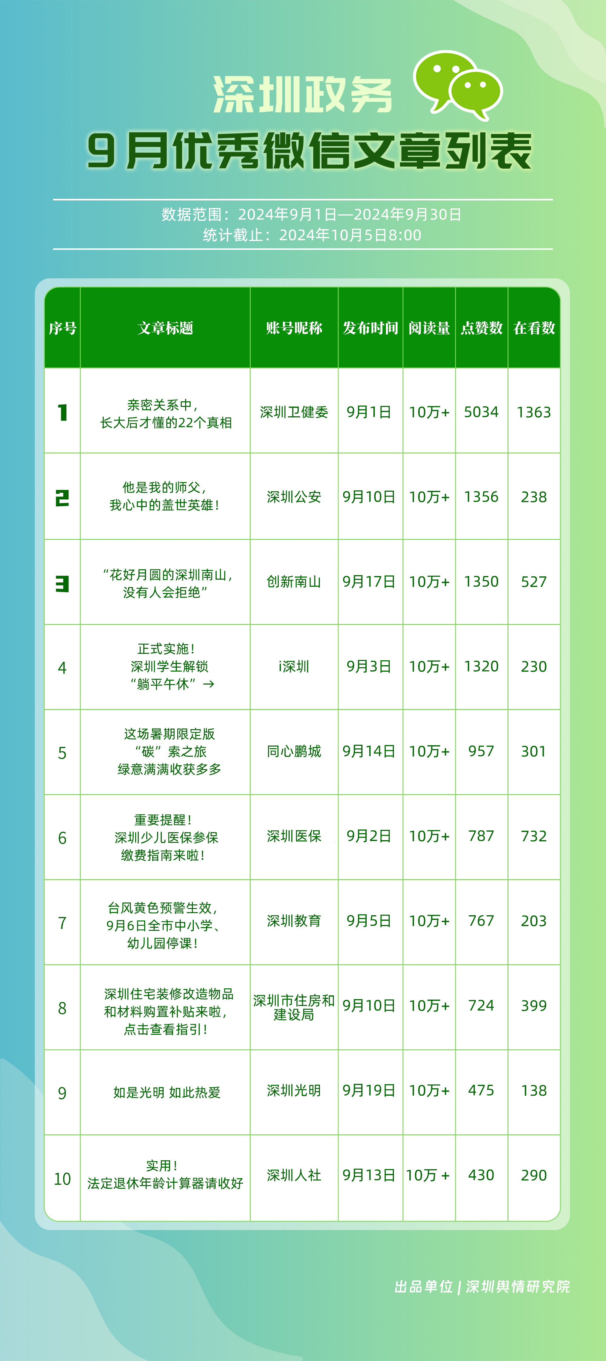 9月,“幸福福田”“深圳龍崗發(fā)布”“創(chuàng)新南山”“深圳龍華”“羅湖發(fā)布”“深圳光明”“青春深圳”“深圳衛(wèi)健委”“濱海寶安”和“深圳公安”共10個政務(wù)頭條號入選“優(yōu)秀政務(wù)頭條號”榜單。文章《剛剛!20多分鐘警報響徹深圳,不少人瞬間淚目……》涉及重大歷史節(jié)點,引發(fā)市民深刻共鳴,《耳朵總是癢癢癢,是怎么回事?》《強冷空氣即將抵達廣東!國慶出游天氣……》等深入民生領(lǐng)域、緊貼節(jié)假日需求,提供了健康知識科普和氣象信息,以高度實用價值獲得網(wǎng)民點贊。