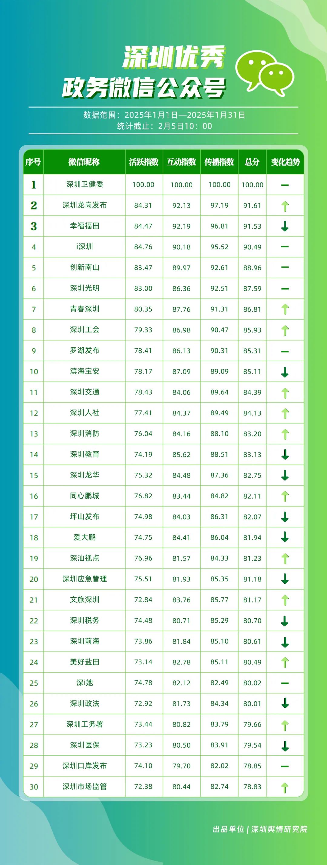 1月,“深圳衛(wèi)健委”“深圳龍崗發(fā)布”“幸福福田”“i深圳”“創(chuàng)新南山”“深圳光明”“青春深圳”“深圳工會”“羅湖發(fā)布”“濱海寶安”等30個賬號入選“深圳優(yōu)秀政務(wù)微信公眾號”。其中,“深圳衛(wèi)健委”各方面表現(xiàn)卓越,位于榜單首位,獲得總分100分?!吧钲邶垗彴l(fā)布”“青春深圳”“深圳工會”排名在本期有所提升,反映了這些賬號在內(nèi)容創(chuàng)新與受眾互動方面的不懈努力?!癷深圳”“創(chuàng)新南山”“深圳光明”“羅湖發(fā)布”則保持了穩(wěn)健的排名,持續(xù)在政務(wù)信息的傳播中扮演著不可或缺的角色。