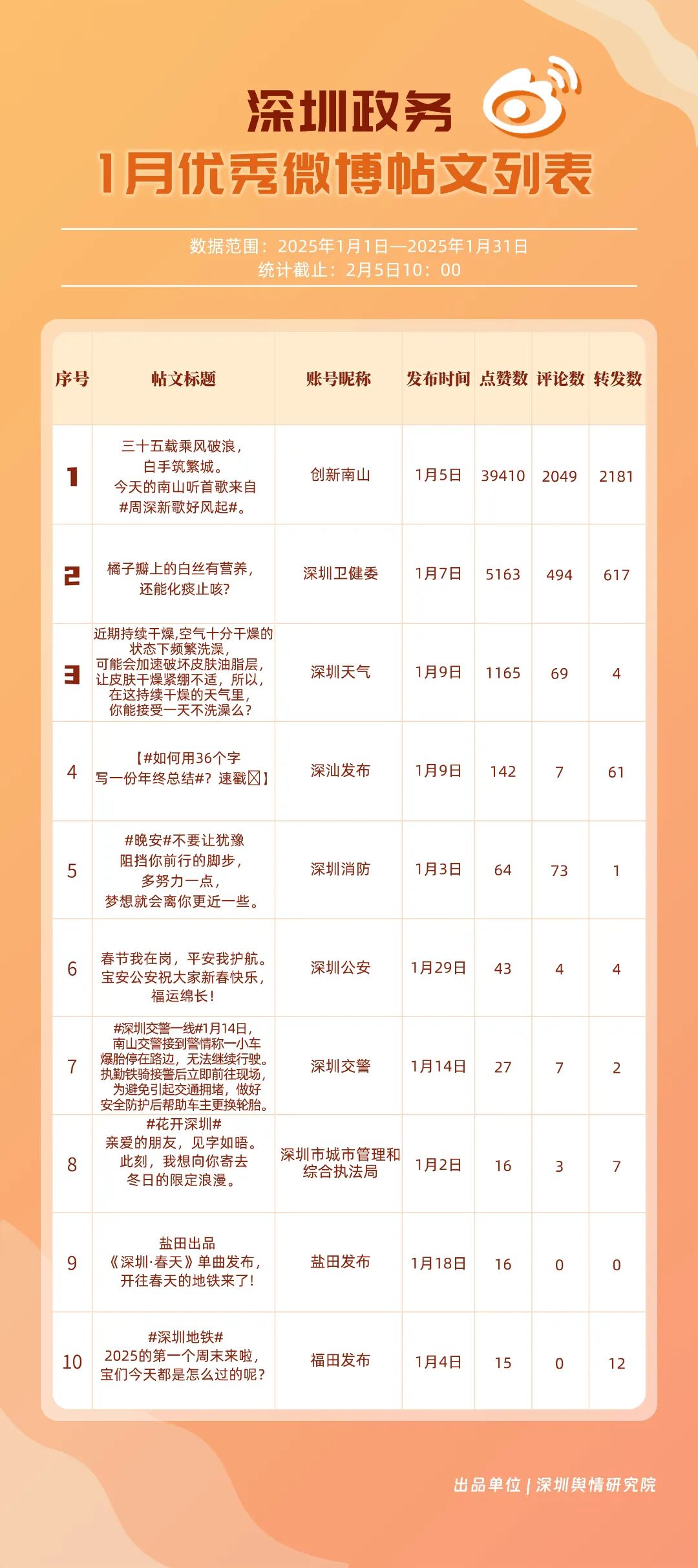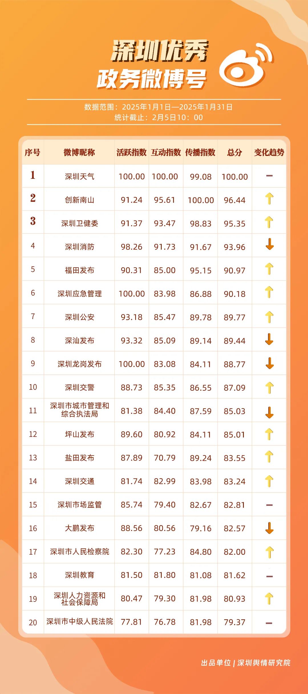 1月,“深圳天氣”“創(chuàng)新南山”“深圳衛(wèi)健委”“深圳消防”“福田發(fā)布”“深圳應(yīng)急管理”“深圳公安”“深汕發(fā)布”“深圳龍崗發(fā)布”“深圳交警”等20個賬號入選“優(yōu)秀政務(wù)微博號”?!吧钲谔鞖狻睉{借高活躍度、互動量等獲得滿分,“創(chuàng)新南山”“深圳衛(wèi)健委”賬號則在1月發(fā)力宣傳,排名上升至榜單第二、三位。同時,“深圳消防”“福田發(fā)布”“深圳應(yīng)急管理”賬號總分在90分以上,彰顯了他們在提升公眾安全意識、促進(jìn)政民互動等方面所做出的積極貢獻(xiàn)。