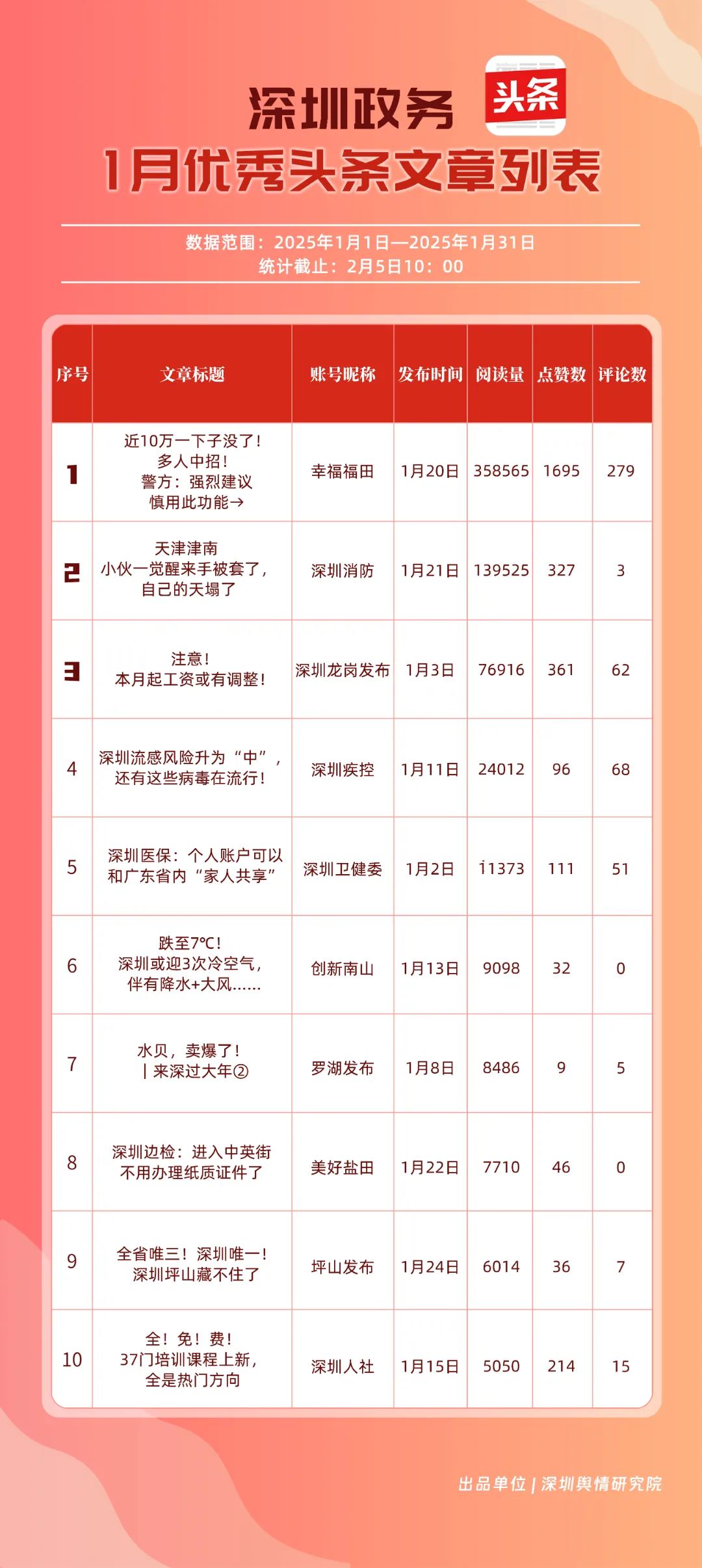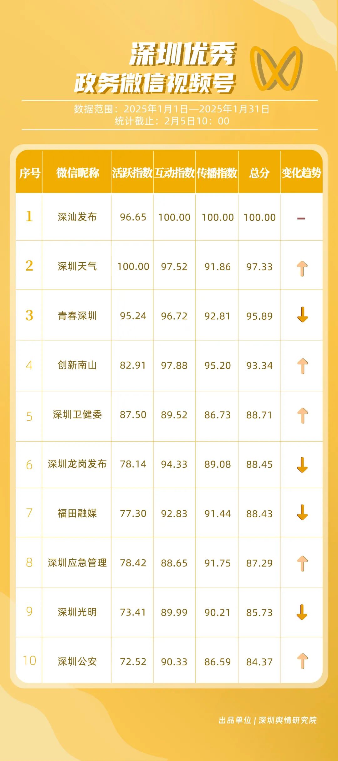 2025年1月期《深圳優(yōu)秀政務(wù)新媒體矩陣》發(fā)布,一同揭曉哪些政務(wù)新媒體矩陣能夠憑借其卓越表現(xiàn)脫穎而出,成為推動政務(wù)信息傳播與服務(wù)模式創(chuàng)新的領(lǐng)航者,引領(lǐng)政務(wù)新媒體運(yùn)營邁向新高度。