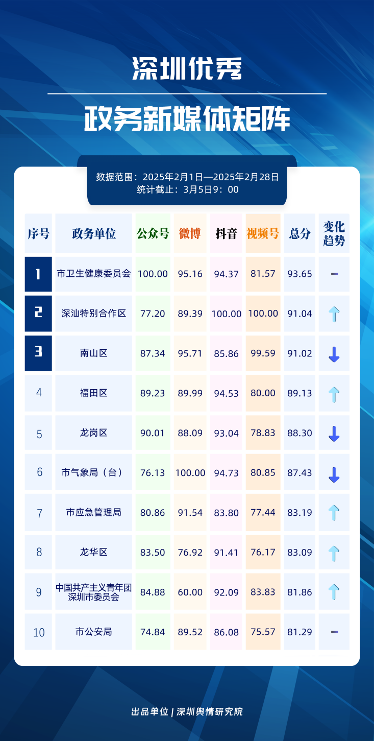 2月,市衛(wèi)生健康委、深汕特別合作區(qū)、南山區(qū)、福田區(qū)、龍崗區(qū)、市氣象局、市應(yīng)急管理局、龍華區(qū)、中國共產(chǎn)主義青年團(tuán)深圳市委員會(huì)、市公安局榮登“深圳優(yōu)秀政務(wù)新媒體矩陣”榜單。2月,市衛(wèi)生健康委賬號(hào)運(yùn)營成績亮眼,微信公眾號(hào)平臺(tái)閱讀量破10萬次的文章超60篇;深汕特別合作區(qū)新媒體矩陣緊抓網(wǎng)絡(luò)熱點(diǎn),作品吸引力顯著;南山區(qū)新媒體矩陣則持續(xù)發(fā)力宣傳,其微博號(hào)、頭條號(hào)在對應(yīng)平臺(tái)榜單中居于前二位置。以上賬號(hào)在“深圳優(yōu)秀政務(wù)新媒體矩陣”榜單中榮獲前三名。此外,福田區(qū)新媒體矩陣深耕短視頻領(lǐng)域與今日頭條平臺(tái),位于“深圳優(yōu)秀政務(wù)新媒體矩陣”第四名,彰顯出優(yōu)秀的內(nèi)容產(chǎn)出能力;龍崗區(qū)新媒體矩陣的抖音號(hào)分?jǐn)?shù)超93分,反映其在視頻制作方面的良苦用心,不斷提升內(nèi)容傳播價(jià)值;市氣象局新媒體矩陣則在微博、抖音平臺(tái)持續(xù)創(chuàng)新氣象領(lǐng)域內(nèi)容,打造“趣味科普+民生服務(wù)”雙驅(qū)模式。