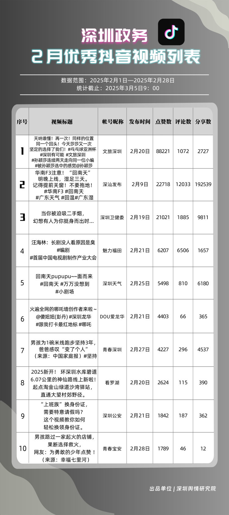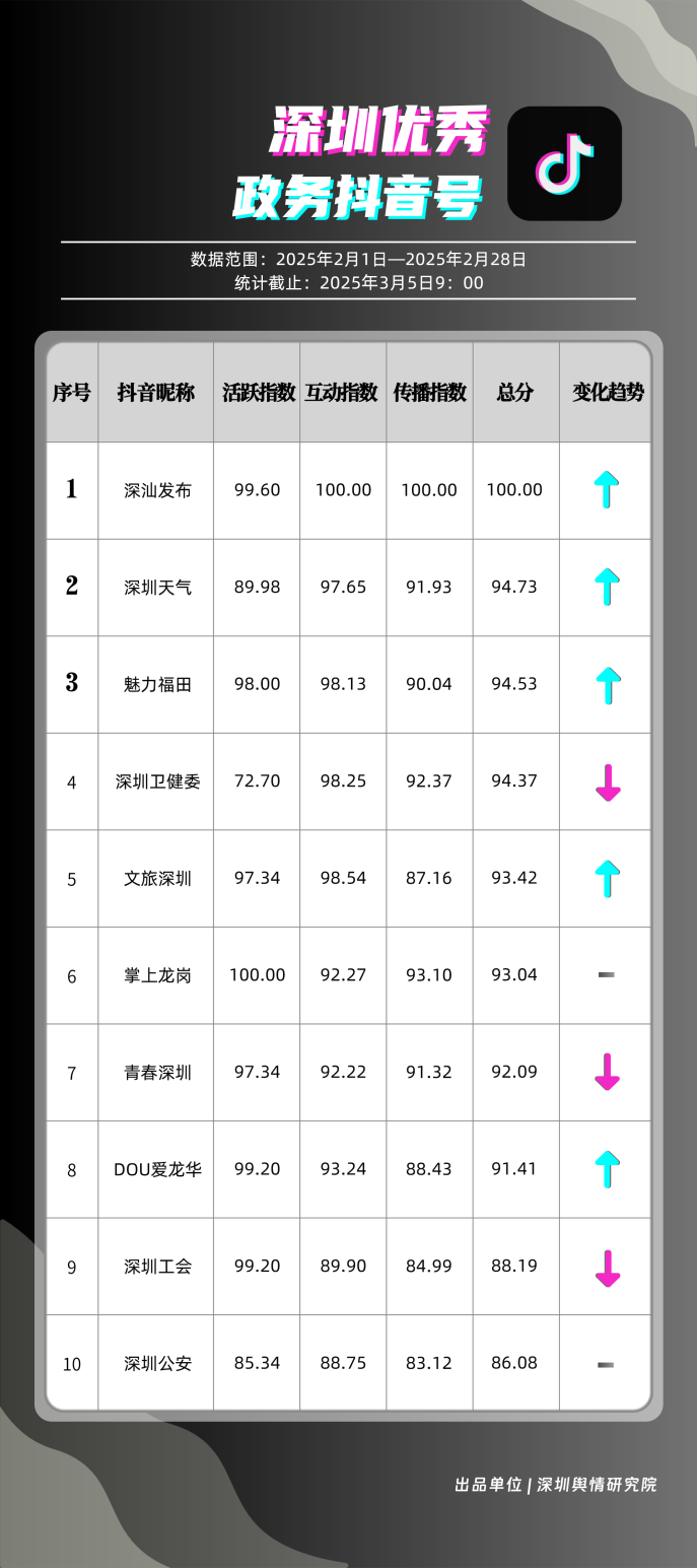 2月,“深汕發(fā)布”“深圳天氣”“魅力福田”“深圳衛(wèi)健委”“文旅深圳”“掌上龍崗”“青春深圳”“DOU愛龍華”“深圳工會(huì)”“深圳公安”共10個(gè)政務(wù)抖音號(hào)獲得“深圳優(yōu)秀政務(wù)抖音號(hào)”稱號(hào)?!吧钌前l(fā)布”位于榜單第一名,值得關(guān)注的是,該賬號(hào)2月作品總分享數(shù)超20萬次,其中有關(guān)“華南地區(qū)回南天”的視頻單條分享量達(dá)到19萬次以上,展現(xiàn)出強(qiáng)勁的傳播力?!吧钲谔鞖狻薄镑攘ΩL铩薄吧钲谛l(wèi)健委”三賬號(hào)堅(jiān)持輸出優(yōu)質(zhì)內(nèi)容,得分均在94分以上,展現(xiàn)出深圳政務(wù)新媒體賬號(hào)在短視頻傳播領(lǐng)域的創(chuàng)新活力。