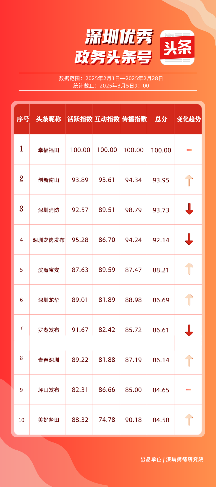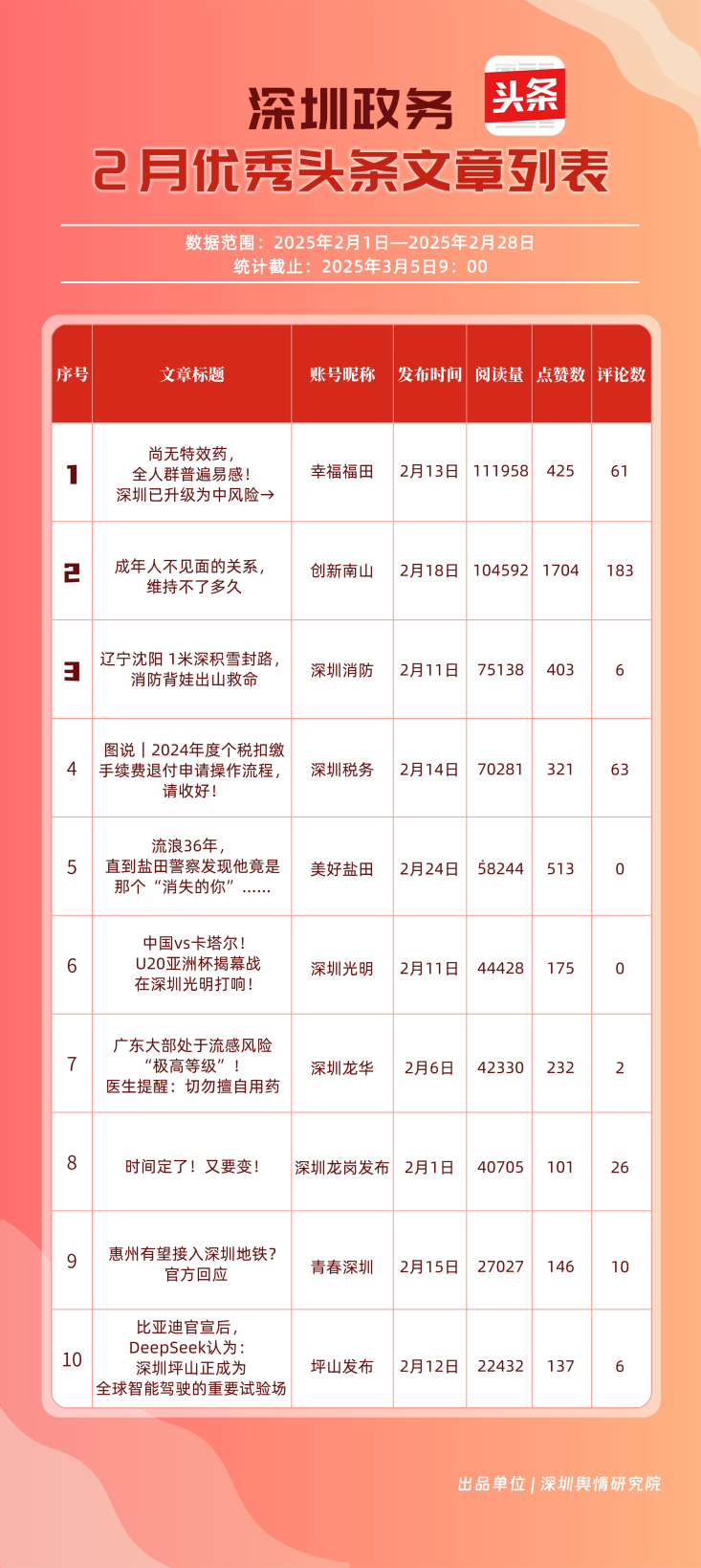 2月,“幸福福田”“創(chuàng)新南山”“深圳消防”“深圳龍崗發(fā)布”“濱海寶安”“深圳龍華”“羅湖發(fā)布”“青春深圳”“坪山發(fā)布”“美好鹽田”共10個(gè)政務(wù)頭條號(hào)入選“優(yōu)秀政務(wù)頭條號(hào)”榜單?!靶腋8L铩?月今日頭條作品總閱讀數(shù)超60萬,綜合實(shí)力較強(qiáng),多次位居頭條平臺(tái)榜單第一?!皠?chuàng)新南山”“深圳消防”“深圳龍崗發(fā)布”總分均在90分以上,展現(xiàn)出深圳政務(wù)頭條號(hào)的持續(xù)影響力,為其他政務(wù)賬號(hào)提供了可借鑒的運(yùn)營范例。