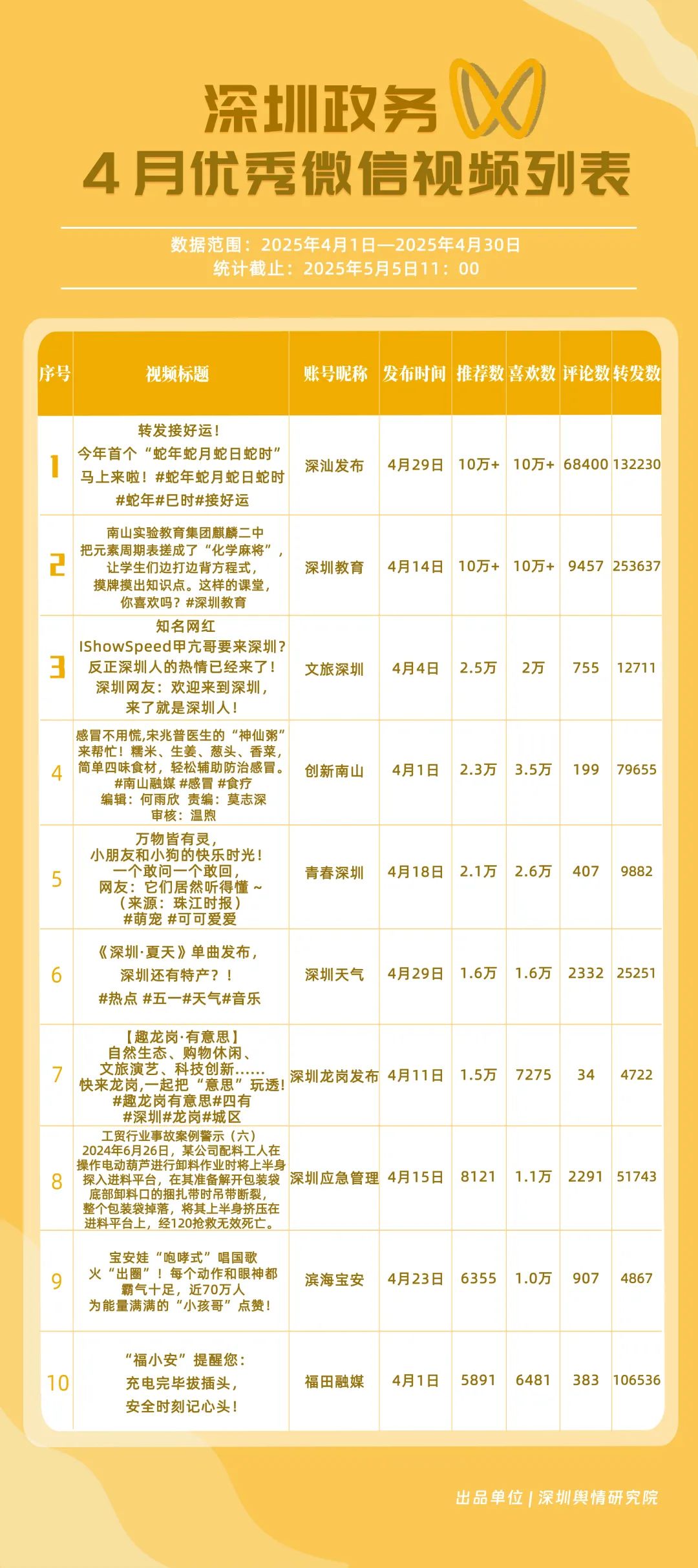 4月,獲“深圳優(yōu)秀政務(wù)微信視頻號(hào)”稱(chēng)號(hào)的是“深汕發(fā)布”“深圳教育”“創(chuàng)新南山”“文旅深圳”“福田融媒”“青春深圳”“深圳天氣”“深圳應(yīng)急管理”“深圳龍崗發(fā)布”“濱海寶安”。其中,“深汕發(fā)布”憑借亮眼的數(shù)據(jù)表現(xiàn)成為榜首,其一條有關(guān)“蛇年蛇月蛇日蛇時(shí)”的視頻作品點(diǎn)贊量超10萬(wàn)次、評(píng)論量超6.8萬(wàn)次,轉(zhuǎn)發(fā)量超13萬(wàn)次;“深圳教育”持續(xù)穩(wěn)定輸出優(yōu)質(zhì)內(nèi)容,以扎實(shí)的運(yùn)營(yíng)實(shí)力鞏固自身影響力,位居榜單第2位;“創(chuàng)新南山”“文旅深圳”“福田融媒”分別位列榜單第3、4、5位,總分超92分,在區(qū)域形象宣傳、文旅資源推廣等方面展現(xiàn)出卓越的傳播效能,成為傳遞區(qū)域特色與發(fā)展動(dòng)態(tài)的重要窗口。