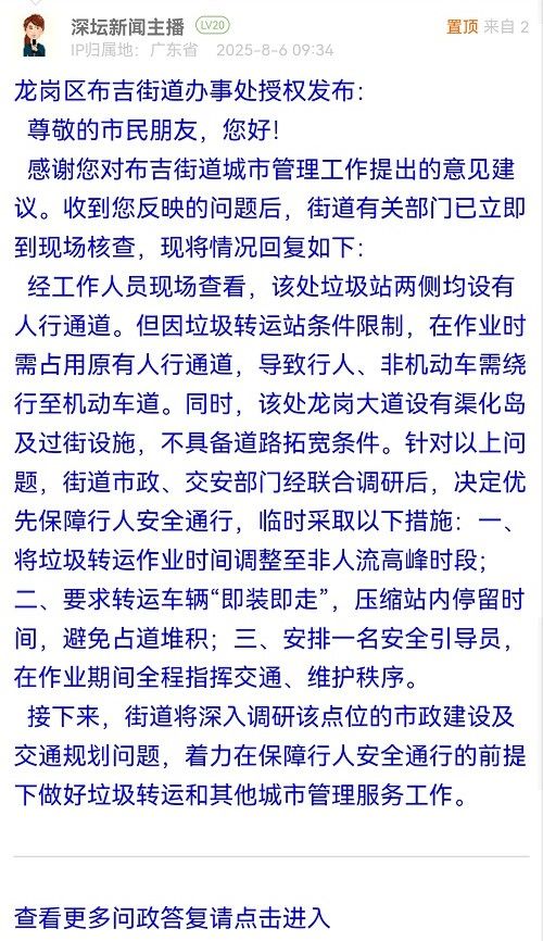 經(jīng)工作人員現(xiàn)場(chǎng)查看,該處垃圾站兩側(cè)均設(shè)有人行通道。但因垃圾轉(zhuǎn)運(yùn)站條件限制,在作業(yè)時(shí)需占用原有人行通道,導(dǎo)致行人、非機(jī)動(dòng)車(chē)需繞行至機(jī)動(dòng)車(chē)道。同時(shí),該處龍崗大道設(shè)有渠化島及過(guò)街設(shè)施,不具備道路拓寬條件。針對(duì)以上問(wèn)題,街道市政、交安部門(mén)經(jīng)聯(lián)合調(diào)研后,決定優(yōu)先保障行人安全通行,臨時(shí)采取以下措施:一、將垃圾轉(zhuǎn)運(yùn)作業(yè)時(shí)間調(diào)整至非人流高峰時(shí)段;二、要求轉(zhuǎn)運(yùn)車(chē)輛“即裝即走”,壓縮站內(nèi)停留時(shí)間,避免占道堆積;三、安排一名安全引導(dǎo)員,在作業(yè)期間全程指揮交通、維護(hù)秩序。