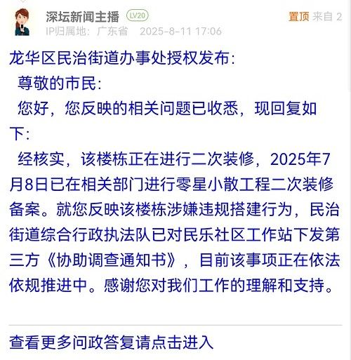 經(jīng)核實(shí),該樓棟正在進(jìn)行二次裝修,2025年7月8日已在相關(guān)部門(mén)進(jìn)行零星小散工程二次裝修備案。就您反映該樓棟涉嫌違規(guī)搭建行為,民治街道綜合行政執(zhí)法隊(duì)已對(duì)民樂(lè)社區(qū)工作站下發(fā)第三方《協(xié)助調(diào)查通知書(shū)》,目前該事項(xiàng)正在依法依規(guī)推進(jìn)中。感謝您對(duì)我們工作的理解和支持。