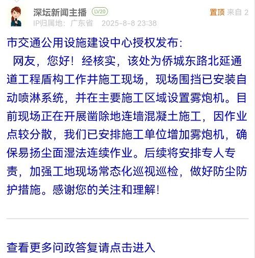 網(wǎng)友,您好!經(jīng)核實(shí),該處為僑城東路北延通道工程盾構(gòu)工作井施工現(xiàn)場(chǎng),現(xiàn)場(chǎng)圍擋已安裝自動(dòng)噴淋系統(tǒng),并在主要施工區(qū)域設(shè)置霧炮機(jī)。目前現(xiàn)場(chǎng)正在開(kāi)展鑿除地連墻混凝土施工,因作業(yè)點(diǎn)較分散,我們已安排施工單位增加霧炮機(jī),確保易揚(yáng)塵面濕法連續(xù)作業(yè)。后續(xù)將安排專人專責(zé),加強(qiáng)工地現(xiàn)場(chǎng)常態(tài)化巡視巡檢,做好防塵防護(hù)措施。感謝您的關(guān)注和理解!