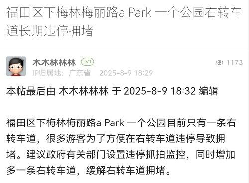 27. 帖文《福田區(qū)下梅林梅麗路a?Park?一個(gè)公園右轉(zhuǎn)車(chē)道長(zhǎng)期違停擁堵》