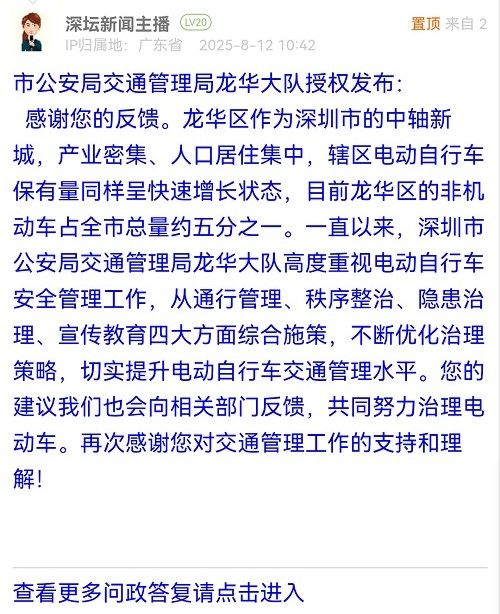 感謝您的反饋。龍華區(qū)作為深圳市的中軸新城,產(chǎn)業(yè)密集、人口居住集中,轄區(qū)電動(dòng)自行車(chē)保有量同樣呈快速增長(zhǎng)狀態(tài),目前龍華區(qū)的非機(jī)動(dòng)車(chē)占全市總量約五分之一。一直以來(lái),深圳市公安局交通管理局龍華大隊(duì)高度重視電動(dòng)自行車(chē)安全管理工作,從通行管理、秩序整治、隱患治理、宣傳教育四大方面綜合施策,不斷優(yōu)化治理策略,切實(shí)提升電動(dòng)自行車(chē)交通管理水平。您的建議我們也會(huì)向相關(guān)部門(mén)反饋,共同努力治理電動(dòng)車(chē)。再次感謝您對(duì)交通管理工作的支持和理解!