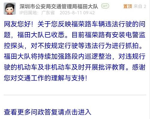 網(wǎng)友您好!關(guān)于您反映福榮路車(chē)輛違法行駛的問(wèn)題,福田大隊(duì)已收悉。目前福榮路有安裝電警監(jiān)控探頭,對(duì)不按規(guī)定行駛等違法行為進(jìn)行抓拍。福田大隊(duì)將持續(xù)加強(qiáng)路段內(nèi)巡邏整治,對(duì)違規(guī)行駛的機(jī)動(dòng)車(chē)及非機(jī)動(dòng)車(chē)及時(shí)開(kāi)展批評(píng)教育。感謝您對(duì)交通工作的理解與支持!