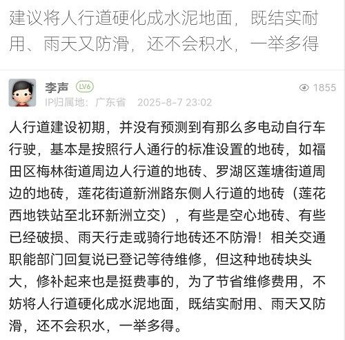 網(wǎng)友,您好!近年來(lái),我們已對(duì)轄區(qū)內(nèi)部分電動(dòng)自行車(chē)通行量較大的道路,試點(diǎn)采用拉絲混凝土工藝進(jìn)行維修改造。下一步將結(jié)合年度養(yǎng)護(hù)計(jì)劃逐步推廣建設(shè)。感謝您的寶貴建議!