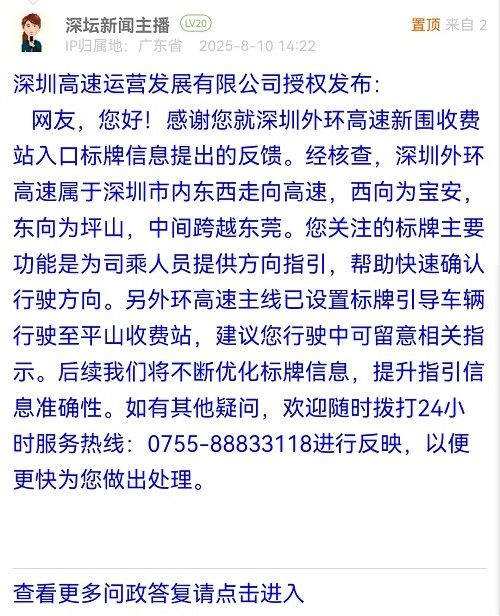 網(wǎng)友,您好!感謝您就深圳外環(huán)高速新圍收費(fèi)站入口標(biāo)牌信息提出的反饋。經(jīng)核查,深圳外環(huán)高速屬于深圳市內(nèi)東西走向高速,西向?yàn)閷毎?,東向?yàn)槠荷剑虚g跨越東莞。您關(guān)注的標(biāo)牌主要功能是為司乘人員提供方向指引,幫助快速確認(rèn)行駛方向。另外環(huán)高速主線已設(shè)置標(biāo)牌引導(dǎo)車(chē)輛行駛至平山收費(fèi)站,建議您行駛中可留意相關(guān)指示。后續(xù)我們將不斷優(yōu)化標(biāo)牌信息,提升指引信息準(zhǔn)確性。如有其他疑問(wèn),歡迎隨時(shí)撥打24小時(shí)服務(wù)熱線:0755-88833118進(jìn)行反映,以便更快為您做出處理。