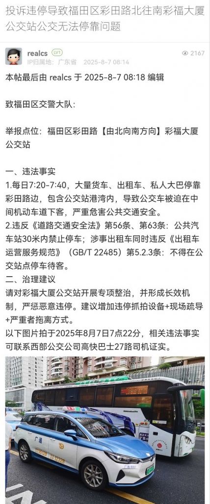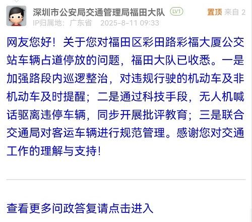 16. 帖文《投訴違停導(dǎo)致福田區(qū)彩田路北往南彩福大廈公交站公交無(wú)法??繂?wèn)題》