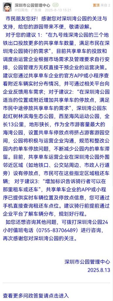 對(duì)于您的建議 1:“在九號(hào)線深灣公園的三個(gè)地鐵出口投放更多的共享單車(chē)數(shù)量,滿足市民在深圳灣公園騎行的需求”,目前共享單車(chē)的投放和調(diào)度由運(yùn)營(yíng)企業(yè)根據(jù)市場(chǎng)需求及管理要求自行安排,公園管理方無(wú)權(quán)直接干預(yù)企業(yè)的運(yùn)營(yíng)決策。建議您通過(guò)共享單車(chē)企業(yè)的官方APP或小程序查看附近車(chē)輛實(shí)時(shí)分布情況,并可通過(guò)相關(guān)平臺(tái)向企業(yè)反饋用車(chē)需求;對(duì)于建議2:“在深圳灣公園適當(dāng)?shù)奈恢没蚋浇黾庸蚕韱诬?chē)的停放點(diǎn),滿足市民中途停放共享單車(chē)的需求”,深圳灣公園東起紅樹(shù)林濱海生態(tài)公園,西至海風(fēng)運(yùn)動(dòng)公園,全長(zhǎng)13公里,地形狹長(zhǎng),作為全市游客量最大的海灣公園,設(shè)置共單車(chē)停放點(diǎn)將擠占游客游園空間,公園將積極與運(yùn)營(yíng)企業(yè)溝通,規(guī)范和整改公園內(nèi)的單車(chē)停放問(wèn)題,不斷減少公園內(nèi)的單車(chē)滯留。目前,共享單車(chē)運(yùn)營(yíng)企業(yè)在深圳灣公園外圍鄰近區(qū)域(如地鐵口、公交站周邊、市政人行道旁)設(shè)有停放點(diǎn),市民可在這些指定區(qū)域租還車(chē)輛; 對(duì)于建議3:“增加標(biāo)識(shí)告訴騎行者可以在那里租車(chē)或還車(chē)”,共享單車(chē)企業(yè)的APP或小程序已提供實(shí)時(shí)車(chē)輛位置及停放點(diǎn)信息,您可通過(guò)手機(jī)直接查詢租還車(chē)點(diǎn)位。建議騎行前提前通過(guò)企業(yè)平臺(tái)了解車(chē)輛分布,規(guī)劃好行程。