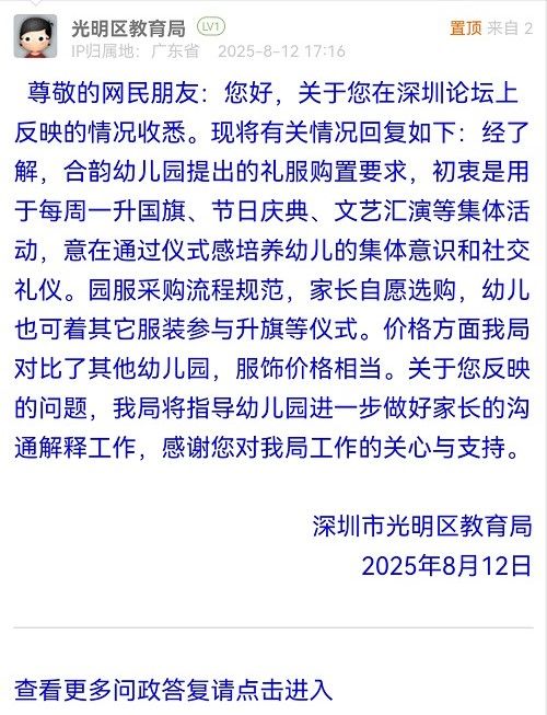 尊敬的網(wǎng)民朋友:您好,關(guān)于您在深圳論壇上反映的情況收悉?,F(xiàn)將有關(guān)情況回復(fù)如下:經(jīng)了解,合韻幼兒園提出的禮服購(gòu)置要求,初衷是用于每周一升國(guó)旗、節(jié)日慶典、文藝匯演等集體活動(dòng),意在通過(guò)儀式感培養(yǎng)幼兒的集體意識(shí)和社交禮儀。園服采購(gòu)流程規(guī)范,家長(zhǎng)自愿選購(gòu),幼兒也可著其它服裝參與升旗等儀式。價(jià)格方面我局對(duì)比了其他幼兒園,服飾價(jià)格相當(dāng)。關(guān)于您反映的問(wèn)題,我局將指導(dǎo)幼兒園進(jìn)一步做好家長(zhǎng)的溝通解釋工作,感謝您對(duì)我局工作的關(guān)心與支持。