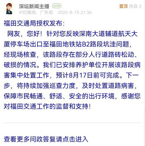 網(wǎng)友,您好!針對(duì)您反映深南大道輔道航天大廈停車場(chǎng)出口至福田地鐵站B2路段坑洼問題,經(jīng)現(xiàn)場(chǎng)核查,該路段存在部分人行道路磚松動(dòng)、破損的情況。我們已安排養(yǎng)護(hù)單位開展該路段病害集中處置工作,預(yù)計(jì)8月17日前可完成。下一步,將持續(xù)加強(qiáng)巡查力度,及時(shí)處置道路病害,保障市民暢通、舒適、安全的出行環(huán)境,感謝您對(duì)福田交通工作的監(jiān)督和支持!