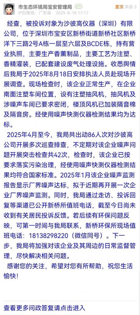 經(jīng)查,被投訴對(duì)象為沙彼高儀器(深圳)有限公司,位于深圳市寶安區(qū)新橋街道新橋社區(qū)新橋洋下三路2號(hào)A棟一層至六層及BCDE棟,持有營業(yè)執(zhí)照,主要生產(chǎn)香薰制品,主要工藝為注塑、香精灌裝,已配套建設(shè)廢氣處理設(shè)施。收悉輿情后我局于2025年8月18日安排執(zhí)法人員赴現(xiàn)場(chǎng)開展調(diào)查?,F(xiàn)場(chǎng)檢查時(shí),該企業(yè)正常生產(chǎn),在企業(yè)南面注塑車間位置,設(shè)有注塑抽風(fēng)機(jī),抽風(fēng)機(jī)及涉噪聲車間已要求密閉,樓頂風(fēng)機(jī)已加裝隔音棉及隔音房。經(jīng)使用噪聲快測(cè)儀器檢測(cè)結(jié)果均為達(dá)標(biāo)。