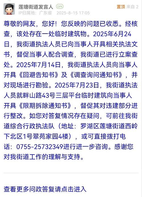 尊敬的網(wǎng)友,您好!您反映的問題已收悉。經(jīng)核查,該處存在一處臨時(shí)建筑物。2025年6月24日,我街道執(zhí)法人員已向當(dāng)事人開具相關(guān)執(zhí)法文書,督促當(dāng)事人配合調(diào)查,我街道已進(jìn)行立案查處。2025年7月14日,我街道執(zhí)法人員向當(dāng)事人開具《回避告知書》及《調(diào)查詢問通知書》,并對(duì)現(xiàn)場(chǎng)進(jìn)行勘驗(yàn)。2025年7月23日,我街道執(zhí)法人員就畔山路43號(hào)三層平臺(tái)臨時(shí)建筑向當(dāng)事人開具《限期拆除通知書》,督促其對(duì)違建部分進(jìn)行整改。如您對(duì)答復(fù)情況存在疑問,可前往我街道綜合行政執(zhí)法隊(duì)(地址:羅湖區(qū)蓮塘街道西嶺下北區(qū)1號(hào)翠苑家園4樓),或可直接撥打電話:0755-25732349進(jìn)行進(jìn)一步咨詢。感謝您對(duì)我街道工作的理解與支持。