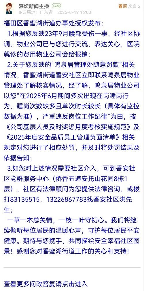 2.關(guān)于您反映的“鳴泉居管理處隨意罰款”相關(guān)情況,香蜜湖街道香安社區(qū)立即聯(lián)系鳴泉居物業(yè)管理處了解核實(shí)情況,經(jīng)了解,鳴泉居物業(yè)公司以您“在2025年6月期間多次出現(xiàn)在崗睡崗行為,睡崗次數(shù)較多且單次時(shí)長較長(具體有監(jiān)控?cái)?shù)據(jù)為準(zhǔn)),嚴(yán)重違反崗位工作紀(jì)律”為由,按《公司基層人員及時(shí)獎(jiǎng)懲月度考核實(shí)施規(guī)范》及《2025年度安全品質(zhì)員工管理負(fù)面清單》相關(guān)規(guī)定對(duì)您進(jìn)行了相應(yīng)處罰,并及時(shí)將處罰結(jié)果及依據(jù)告知;