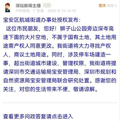 這位市民朋友,您好!獅子山公園旁邊深岑高速下面的大片空地,不屬于國有土地,其土地用途需產(chǎn)權(quán)人同意更改。我街道將大力尋找產(chǎn)權(quán)人,商議土地用途。同時(shí),涉及停車場(chǎng)建造一事,超出街道城市建設(shè)、管理權(quán)限,我街道將提請(qǐng)深圳市交通運(yùn)輸局寶安管理局、深圳市規(guī)劃和自然資源局寶安管理局聯(lián)合研究處置。感謝您的關(guān)注,對(duì)您的生活帶來不便,敬請(qǐng)諒解。