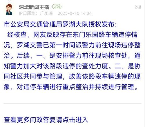 經(jīng)核查,網(wǎng)友反映存在東門樂園路車輛違停情況,羅湖交警已第一時(shí)間派警力前往現(xiàn)場(chǎng)違停整治。后續(xù),一、是安排警力前往現(xiàn)場(chǎng)核查處,通知警力加大對(duì)該路段違停的查處力度。二、是協(xié)同社區(qū)共同參與管理,改善該路段車輛違停的現(xiàn)象,對(duì)違停車輛進(jìn)行重點(diǎn)整治并持續(xù)進(jìn)行管理。