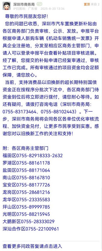 您的問題已收悉,深圳市汽車置換更新補(bǔ)貼由各區(qū)商務(wù)部門負(fù)責(zé)審核、公示、發(fā)放。申報(bào)平臺(tái)根據(jù)申請(qǐng)人新購車輛《機(jī)動(dòng)車銷售統(tǒng)一發(fā)票》開具企業(yè)注冊(cè)地,分發(fā)至相應(yīng)區(qū)商務(wù)主管部門,申請(qǐng)人可以登錄申報(bào)平臺(tái)查看補(bǔ)貼項(xiàng)目審核進(jìn)展。經(jīng)了解,您提交的補(bǔ)貼申請(qǐng)已經(jīng)復(fù)審?fù)ㄟ^,審核工作已完成。所有審核通過的項(xiàng)目資金均會(huì)足額保障,請(qǐng)您放心。