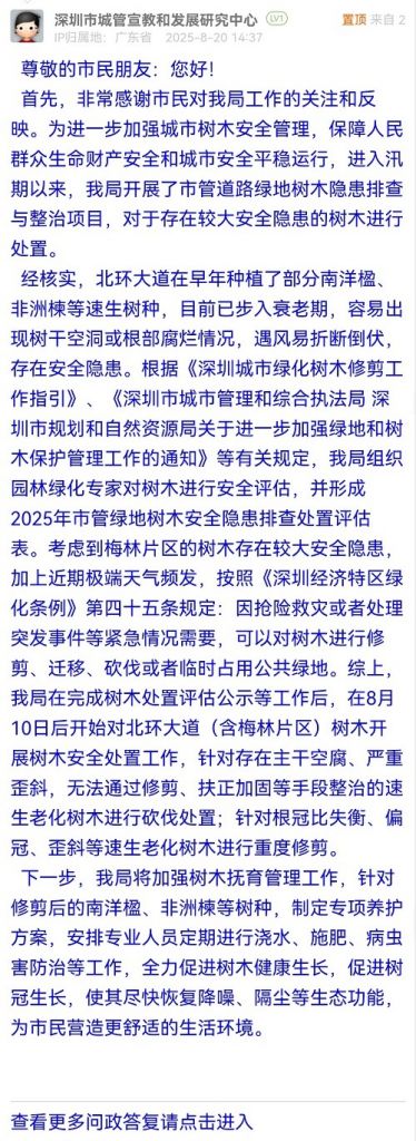 經(jīng)核實(shí),北環(huán)大道在早年種植了部分南洋楹、非洲楝等速生樹種,目前已步入衰老期,容易出現(xiàn)樹干空洞或根部腐爛情況,遇風(fēng)易折斷倒伏,存在安全隱患。根據(jù)《深圳城市綠化樹木修剪工作指引》、《深圳市城市管理和綜合執(zhí)法局 深圳市規(guī)劃和自然資源局關(guān)于進(jìn)一步加強(qiáng)綠地和樹木保護(hù)管理工作的通知》等有關(guān)規(guī)定,我局組織園林綠化專家對(duì)樹木進(jìn)行安全評(píng)估,并形成2025年市管綠地樹木安全隱患排查處置評(píng)估表??紤]到梅林片區(qū)的樹木存在較大安全隱患,加上近期極端天氣頻發(fā),按照《深圳經(jīng)濟(jì)特區(qū)綠化條例》第四十五條規(guī)定:因搶險(xiǎn)救災(zāi)或者處理突發(fā)事件等緊急情況需要,可以對(duì)樹木進(jìn)行修剪、遷移、砍伐或者臨時(shí)占用公共綠地。綜上,我局在完成樹木處置評(píng)估公示等工作后,在8月10日后開始對(duì)北環(huán)大道(含梅林片區(qū))樹木開展樹木安全處置工作,針對(duì)存在主干空腐、嚴(yán)重歪斜,無法通過修剪、扶正加固等手段整治的速生老化樹木進(jìn)行砍伐處置;針對(duì)根冠比失衡、偏冠、歪斜等速生老化樹木進(jìn)行重度修剪。