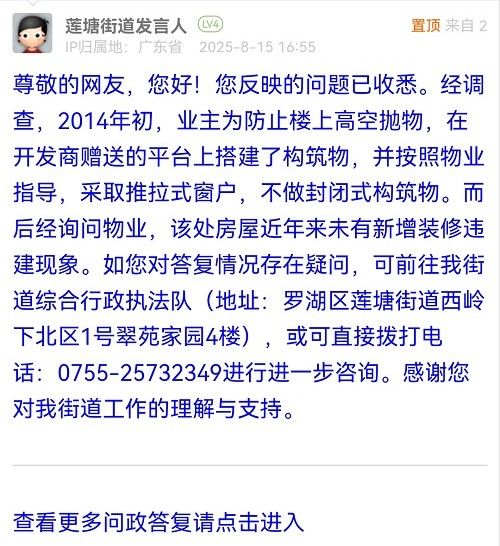 尊敬的網(wǎng)友,您好!您反映的問題已收悉。經(jīng)調(diào)查,2014年初,業(yè)主為防止樓上高空拋物,在開發(fā)商贈(zèng)送的平臺(tái)上搭建了構(gòu)筑物,并按照物業(yè)指導(dǎo),采取推拉式窗戶,不做封閉式構(gòu)筑物。而后經(jīng)詢問物業(yè),該處房屋近年來未有新增裝修違建現(xiàn)象。如您對(duì)答復(fù)情況存在疑問,可前往我街道綜合行政執(zhí)法隊(duì)(地址:羅湖區(qū)蓮塘街道西嶺下北區(qū)1號(hào)翠苑家園4樓),或可直接撥打電話:0755-25732349進(jìn)行進(jìn)一步咨詢。感謝您對(duì)我街道工作的理解與支持。