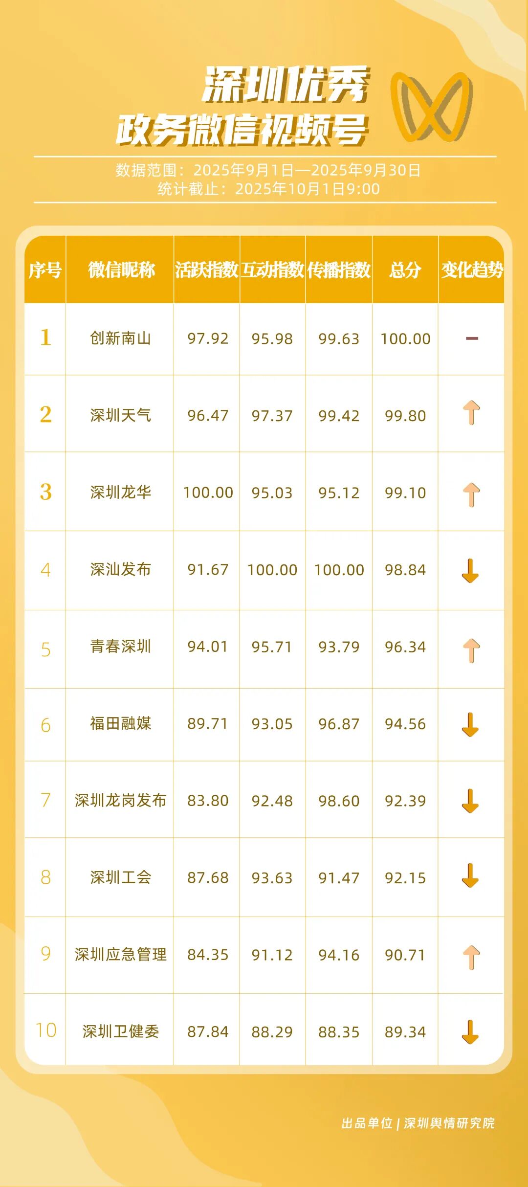 9月,深圳政務(wù)新媒體矩陣持續(xù)優(yōu)化內(nèi)容生態(tài),各單位依托平臺(tái)特色深化服務(wù)效能,南山區(qū)、市衛(wèi)生健康委員會(huì)、市氣象局(臺(tái))、龍崗區(qū)、福田區(qū)、龍華區(qū)、深汕特別合作區(qū)、市應(yīng)急管理局、中國(guó)共產(chǎn)主義青年團(tuán)深圳市委員會(huì)、光明區(qū)的新媒體矩陣入選“深圳優(yōu)秀政務(wù)新媒體矩陣”榜單。9月,南山區(qū)在短視頻平臺(tái)表現(xiàn)突出,抖音、微信視頻號(hào)平臺(tái)均獲滿分;市衛(wèi)生健康委員會(huì)輸出深度內(nèi)容,位列榜單第二;市氣象局(臺(tái))新媒體矩陣居于榜單第三,在9月發(fā)布臺(tái)風(fēng)相關(guān)天氣提醒,獲得公眾廣泛關(guān)注。此外,龍崗區(qū)、福田區(qū)、龍華區(qū)、深汕特別合作區(qū)新媒體矩陣持續(xù)推出優(yōu)質(zhì)內(nèi)容,共同展現(xiàn)了深圳在塑造現(xiàn)代化形象、提升數(shù)字治理能力上的創(chuàng)新引領(lǐng)作用。