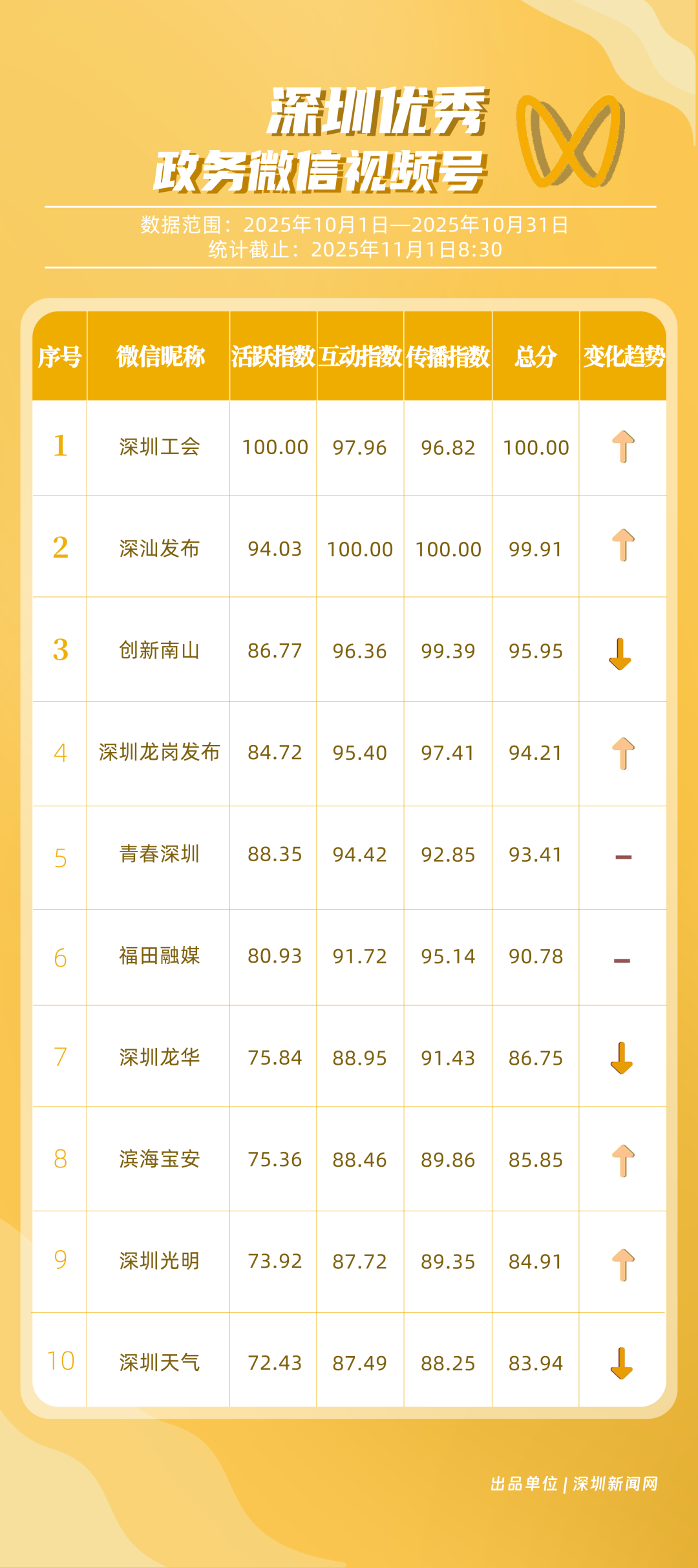 2025年10月期《深圳優(yōu)秀政務(wù)新媒體矩陣》正式發(fā)布,上榜矩陣以深度創(chuàng)新的傳播思路與精細(xì)化的服務(wù)持續(xù)領(lǐng)跑,為政務(wù)新媒體行業(yè)貢獻(xiàn)了可復(fù)制的實(shí)踐經(jīng)驗(yàn),深化政務(wù)信息與公眾喜好的精準(zhǔn)對(duì)接,為深圳政務(wù)新媒體高質(zhì)量發(fā)展注入新動(dòng)能與新活力。