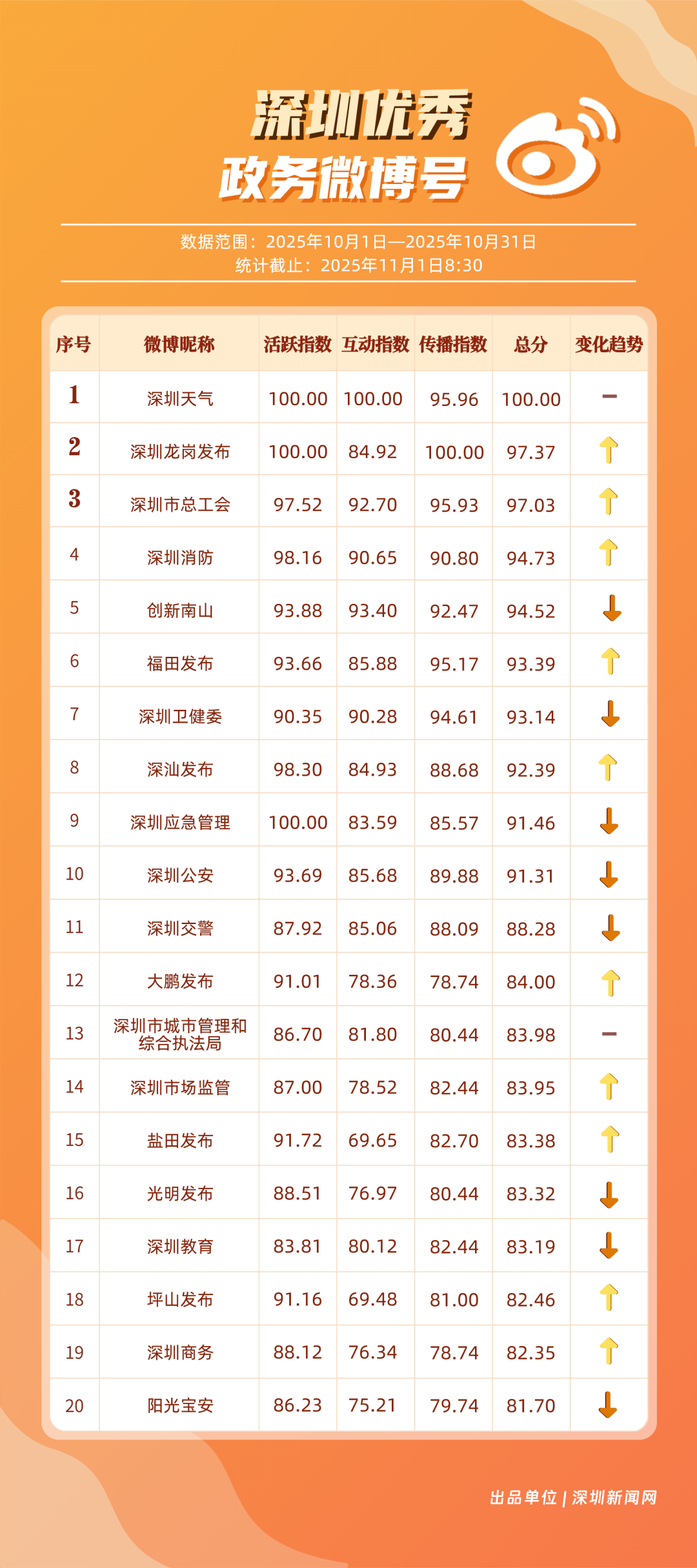 10月,20個(gè)賬號(hào)入選“優(yōu)秀政務(wù)微博號(hào)”榜單,其中包括:“深圳天氣”“深圳龍崗發(fā)布”“深圳市總工會(huì)”“深圳消防”“創(chuàng)新南山”“福田發(fā)布”“深圳衛(wèi)健委”“深汕發(fā)布”“深圳應(yīng)急管理”“深圳公安”等。其中,“深圳天氣”高頻、及時(shí)地發(fā)布天氣相關(guān)內(nèi)容,其中多篇關(guān)于“冷空氣”“入秋”帖文收獲較好互動(dòng)和傳播效果,以100分位列榜單首位;“深圳龍崗發(fā)布”總分97.37分,居于榜單第二,其有關(guān)演唱會(huì)定檔、卷尺哥等內(nèi)容的帖文獲得較好數(shù)據(jù);“深圳市總工會(huì)”關(guān)注職工日常生活,以97.03分居于榜單第三?!吧钲谙馈薄皠?chuàng)新南山”等微博賬號(hào)也通過各自的特色內(nèi)容,展現(xiàn)深圳城市治理、民生服務(wù)的溫度。