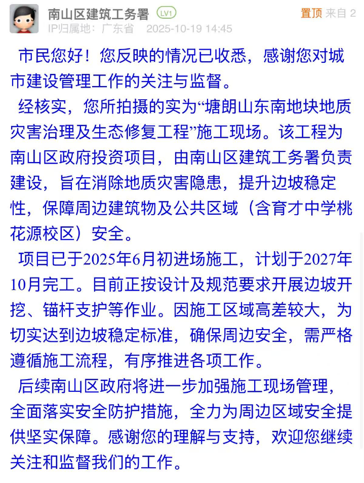 案例點(diǎn)評(píng):針對(duì)市民疑慮,相關(guān)部門(mén)的回應(yīng)展現(xiàn)出“透明化+精細(xì)化”的治理思路:第一時(shí)間明確工程屬性并同步告知工期安排,主動(dòng)消解市民對(duì)工程進(jìn)展的不確定性擔(dān)憂;同時(shí),南山區(qū)建筑工務(wù)署還表示后續(xù)將進(jìn)一步加強(qiáng)現(xiàn)場(chǎng)管理,回應(yīng)關(guān)切。這種回應(yīng)思路既解決了市民的困惑,也通過(guò)可感知的舉措傳遞了對(duì)安全的重視態(tài)度,是城市工程類訴求處置中“信息公開(kāi)”“風(fēng)險(xiǎn)閉環(huán)”的有效示范。