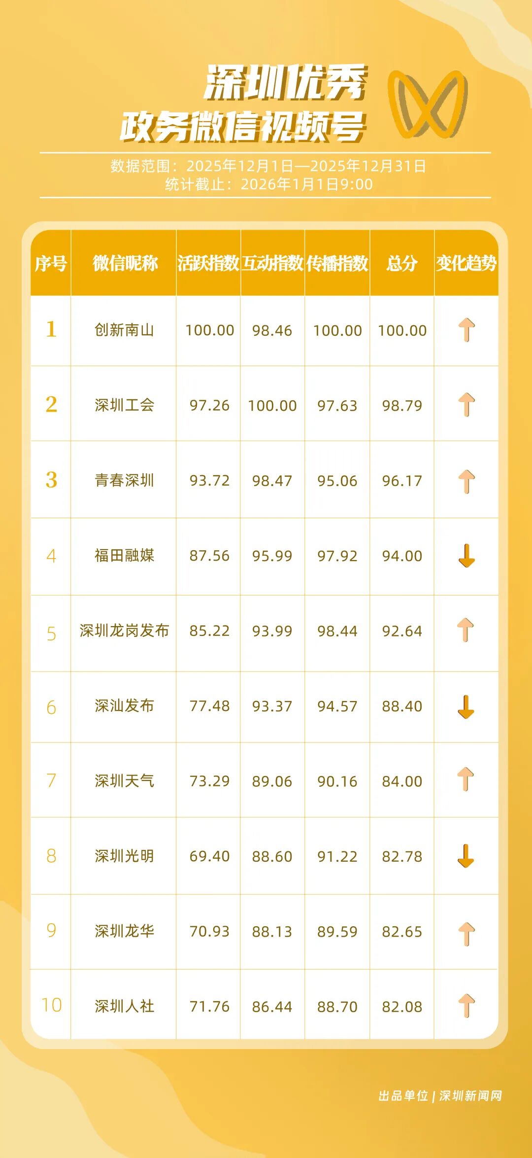 12月,“創(chuàng)新南山”“深圳工會(huì)”“青春深圳”“福田融媒”“深圳龍崗發(fā)布”“深汕發(fā)布”“深圳天氣”“深圳光明”“深圳龍華”“深圳人社”榮獲“優(yōu)秀政務(wù)微信視頻號(hào)”稱號(hào)。“創(chuàng)新南山”活躍指數(shù)、傳播指數(shù)均獲滿分,月作品總轉(zhuǎn)發(fā)量超70萬(wàn),領(lǐng)跑榜單;“深圳工會(huì)”積極發(fā)布熱點(diǎn)、民生類內(nèi)容,精準(zhǔn)對(duì)接市民需求,排名上升至第二名;“青春深圳”互動(dòng)指數(shù)超98分,以高互動(dòng)量位列榜單第三名?!案L锶诿健薄吧钲邶垗彴l(fā)布”兩賬號(hào)立足區(qū)域特色深耕內(nèi)容,得分超90分。上榜微信視頻號(hào)以輕量化短視頻為載體,傳播公眾喜聞樂見的政務(wù)、民生內(nèi)容,打造出兼具傳播力與親和力的政務(wù)宣傳新名片。